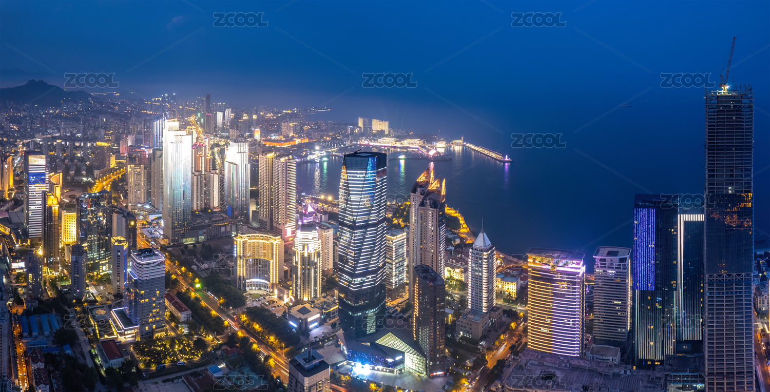 航拍青岛CBD城市海岸线夜景