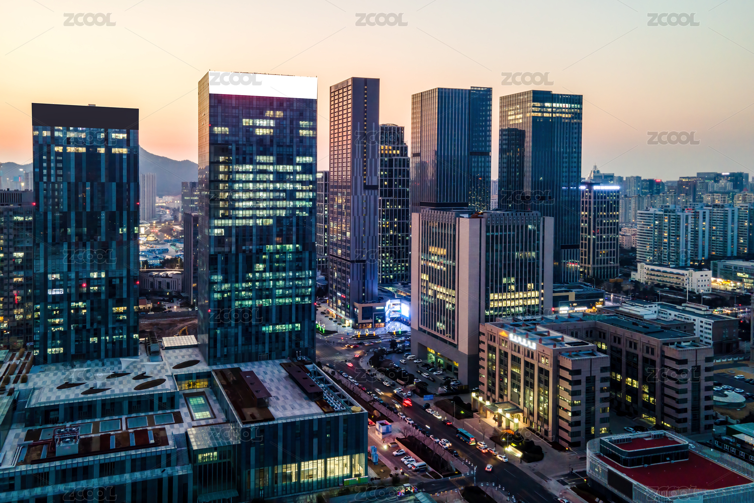 航拍青岛崂山区现代建筑景观和黄昏暮色