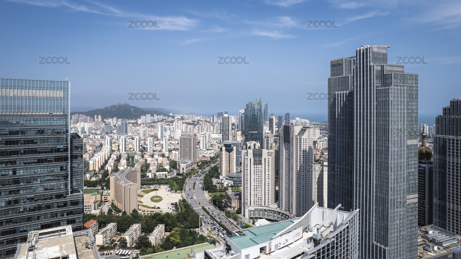 山东青岛浮山湾五四广场城市天际线航拍景观