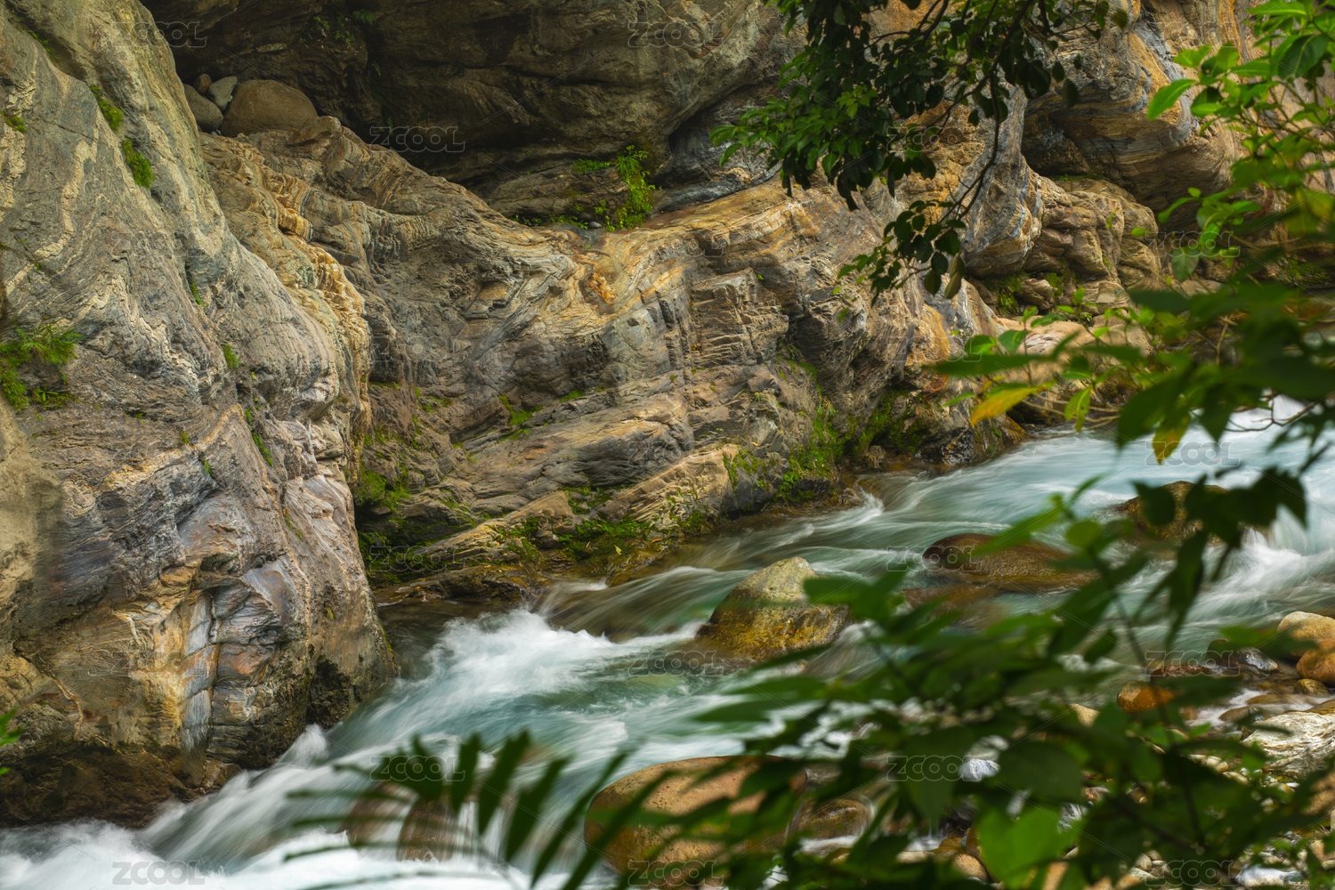 溪色彩缤纷的岩壁与碧绿的溪流