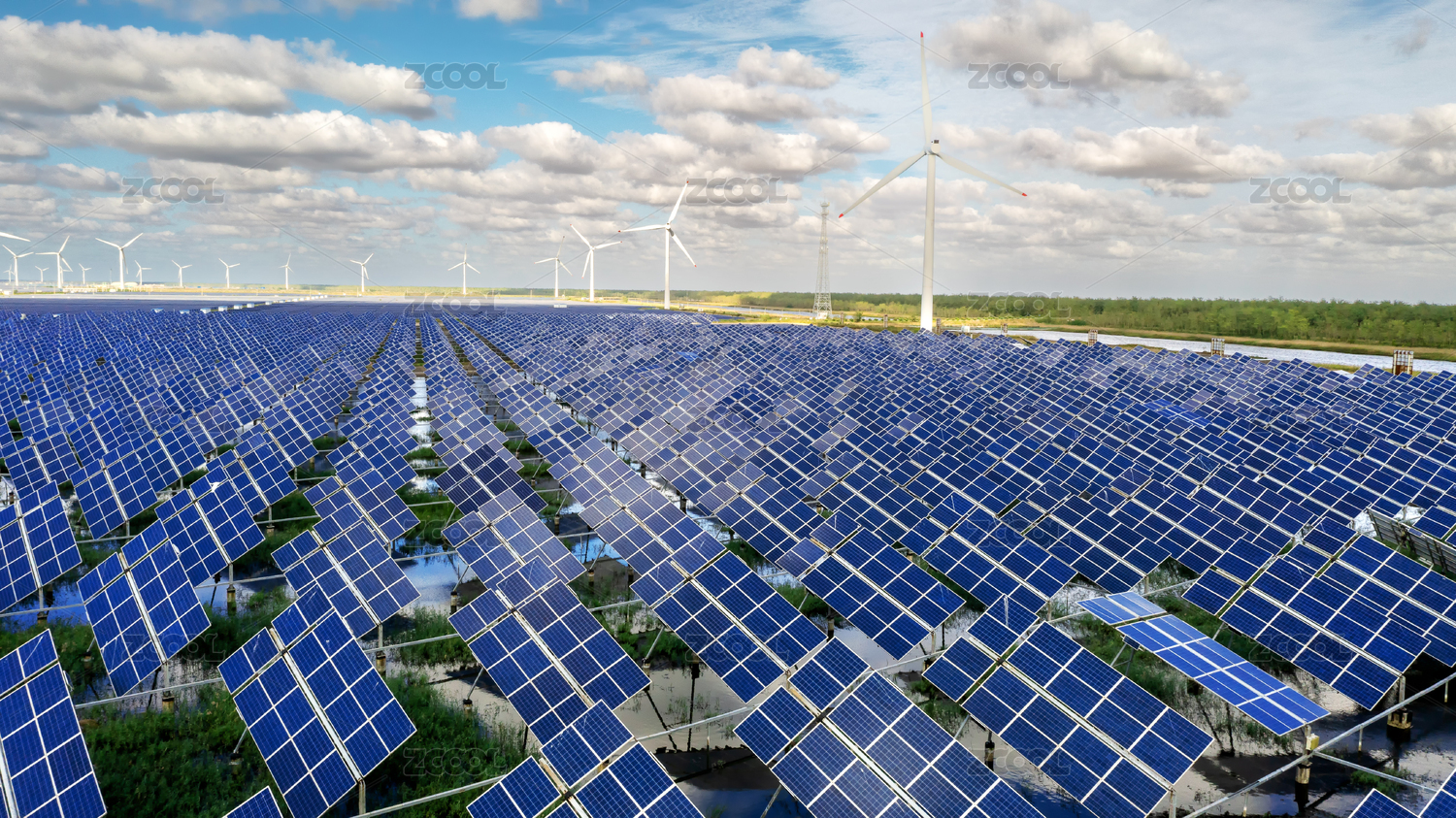 蓝天白云下风力发电机和光伏发电电池板