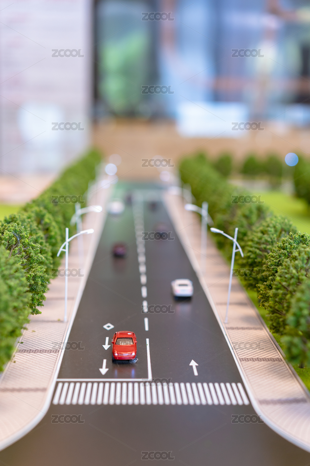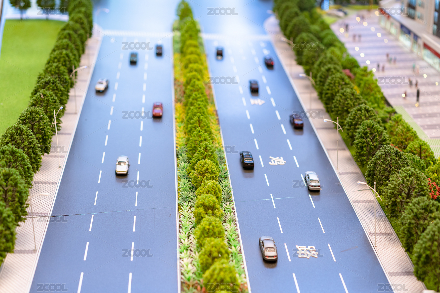 有汽车行驶的道路及行道树、绿地等模型