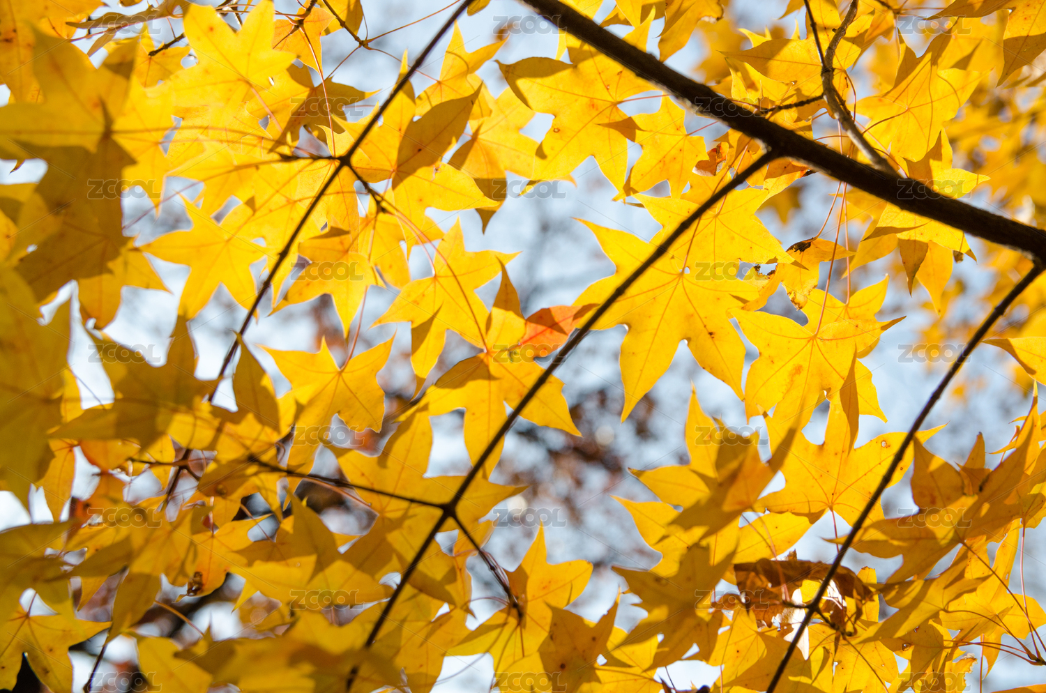 深秋金黄色枫叶特写