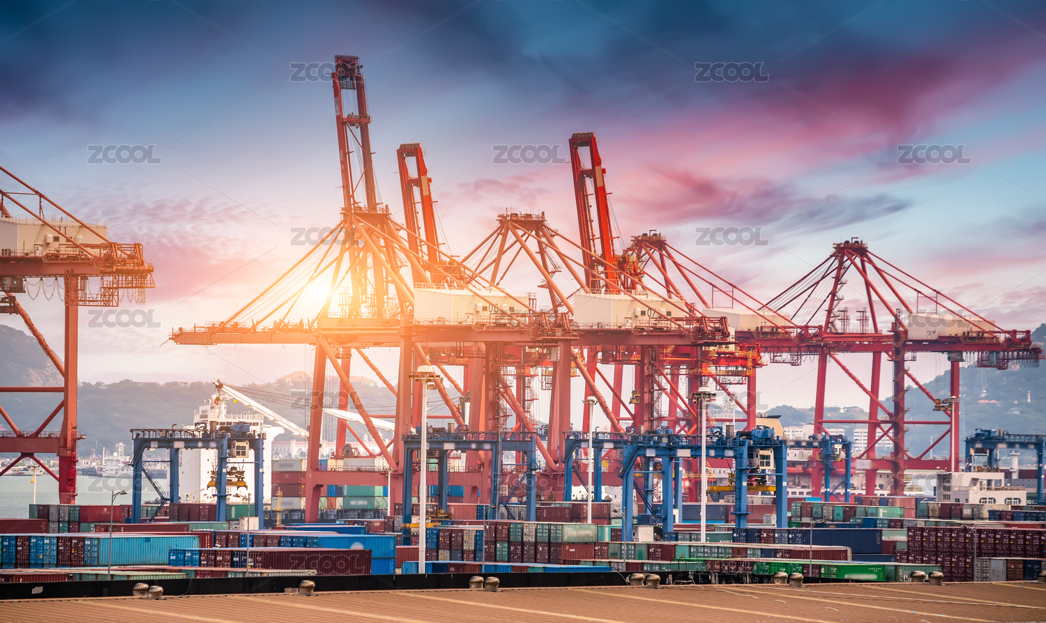 集装箱,港口,夕阳,码头,户外,货物,红色,建筑,工业,起重机