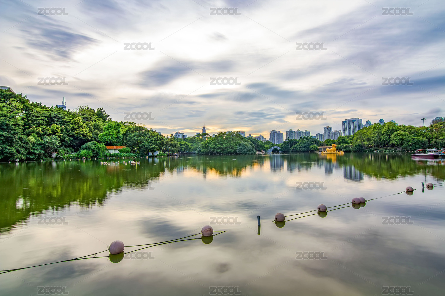 南宁南湖公园夕阳黄昏与城市摩天大楼建筑