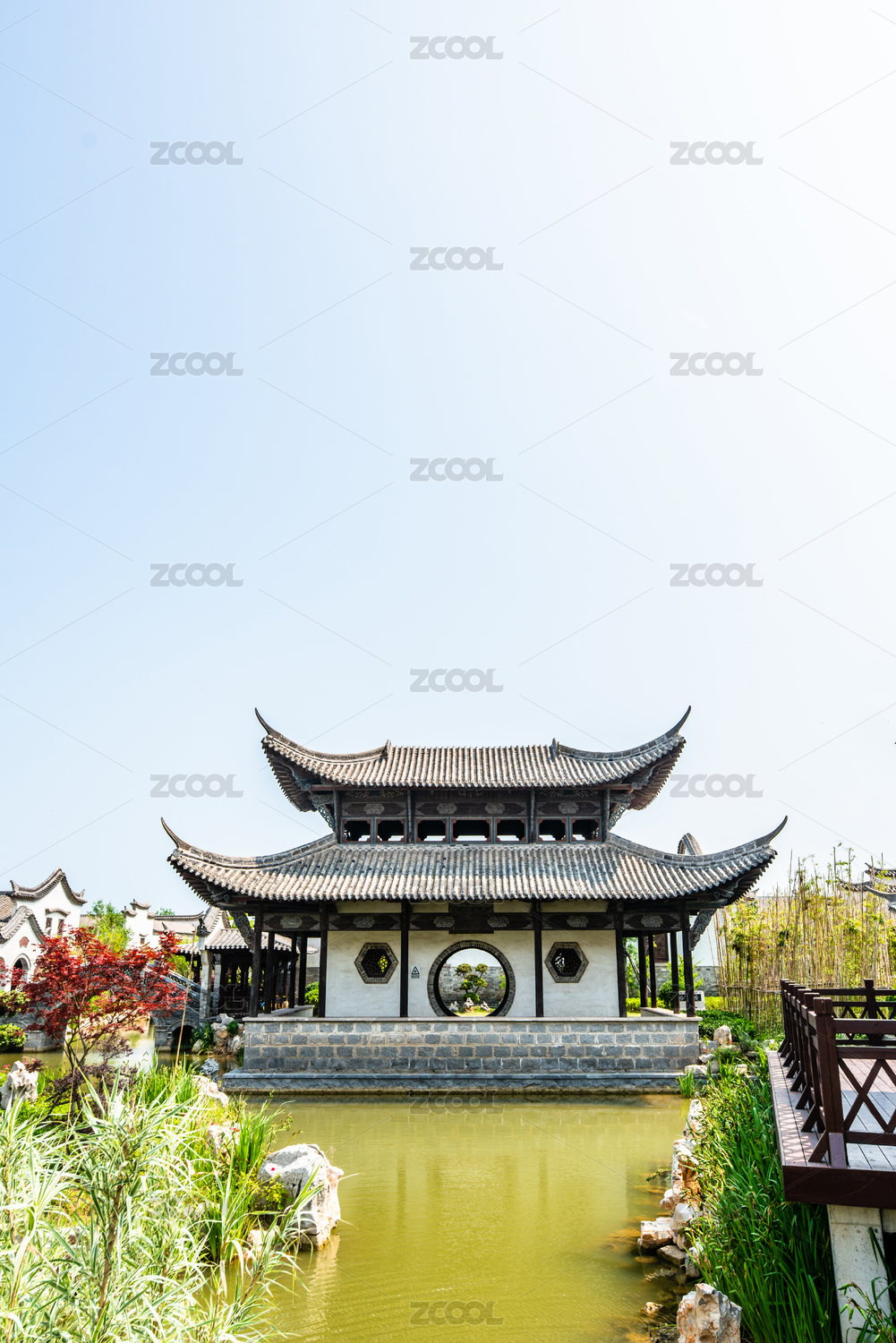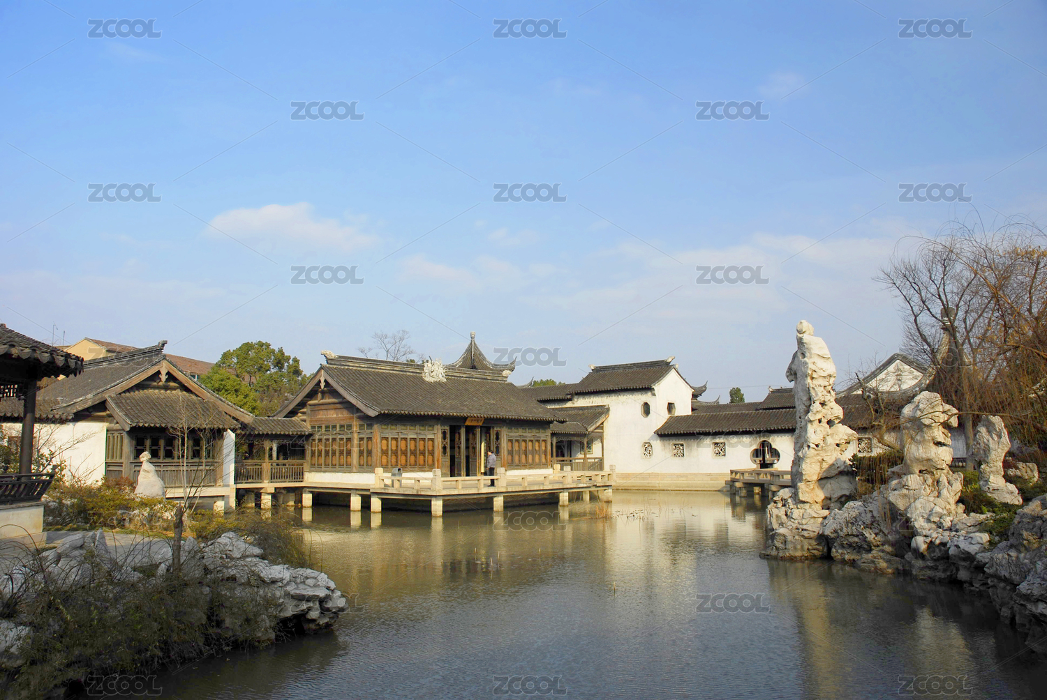 江苏木渎古镇苏州园林秀野园池塘和建筑