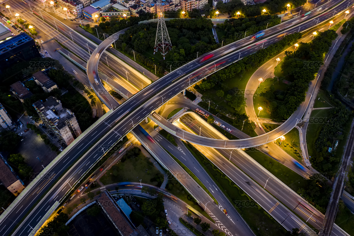 傍晚俯拍中国四川省成都市十陵立交桥。