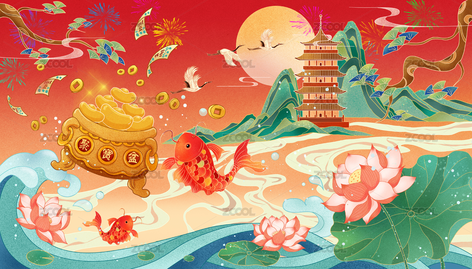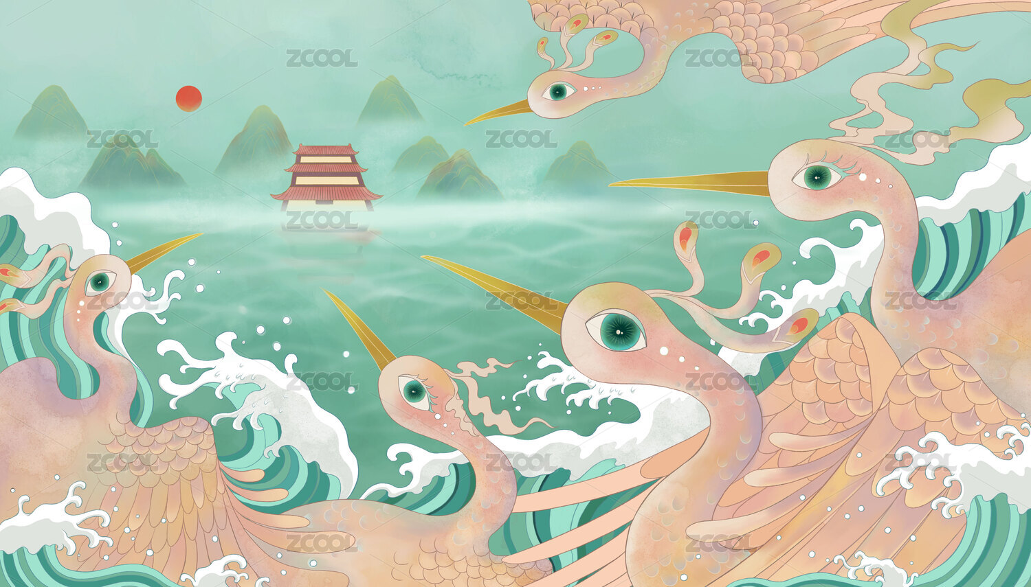 国潮中国风宫殿喜庆祥云凤凰春节插画元素