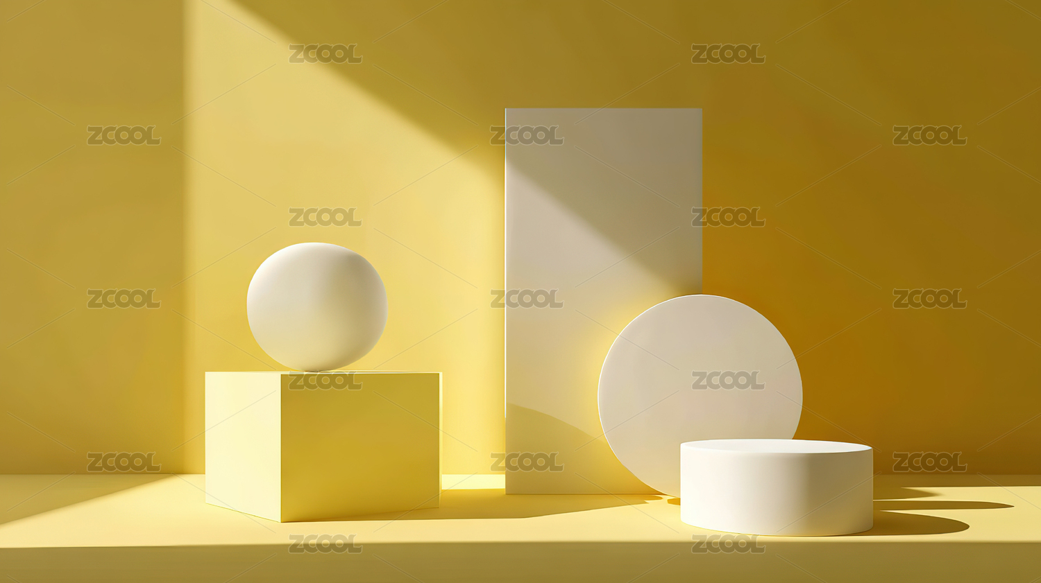 简约风格,室内场景,讲台,白色球体,半圆形物体,淡黄色,窗帘,简洁感,现代感,产品展示