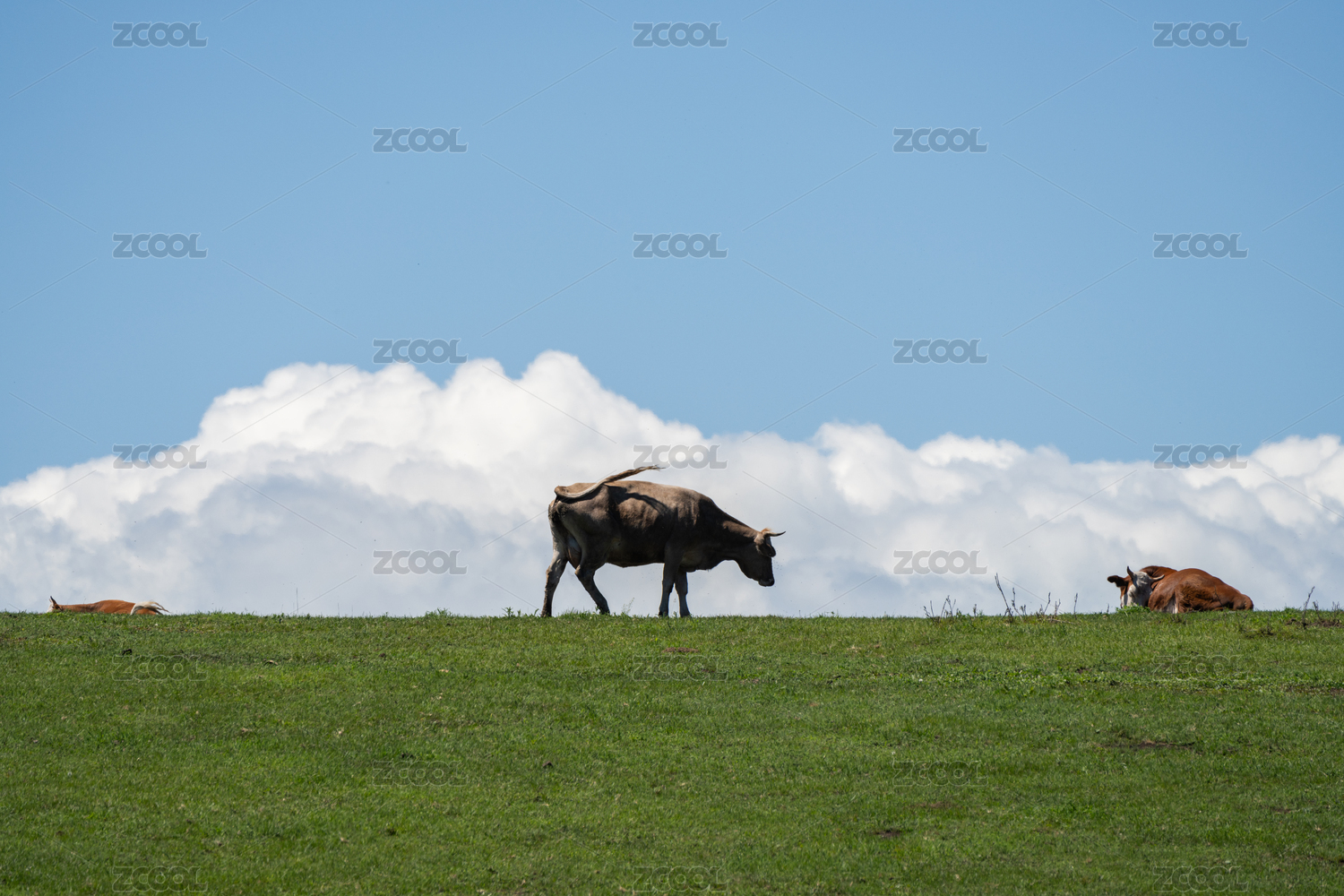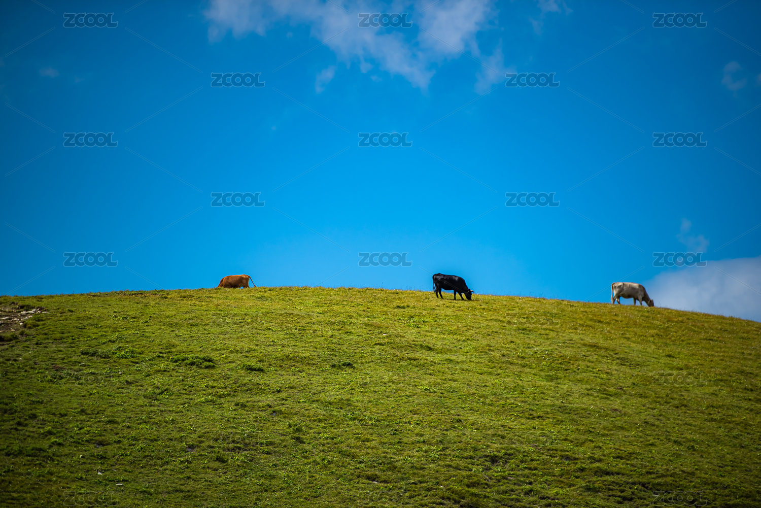 在蓝天白云下天然草原牧场上吃草的奶牛
