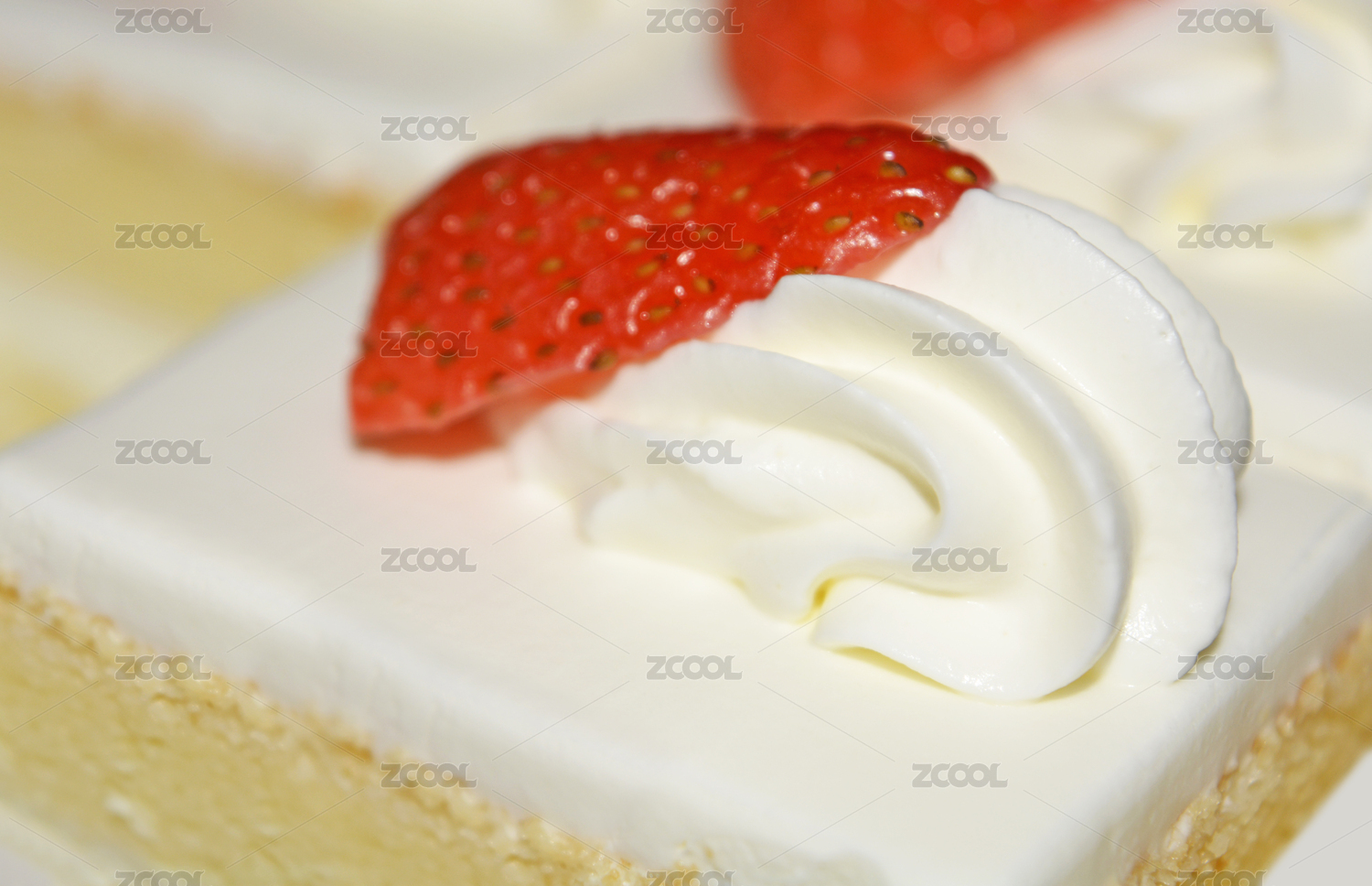 俯拍一盘有草莓装饰的慕斯蛋糕块
