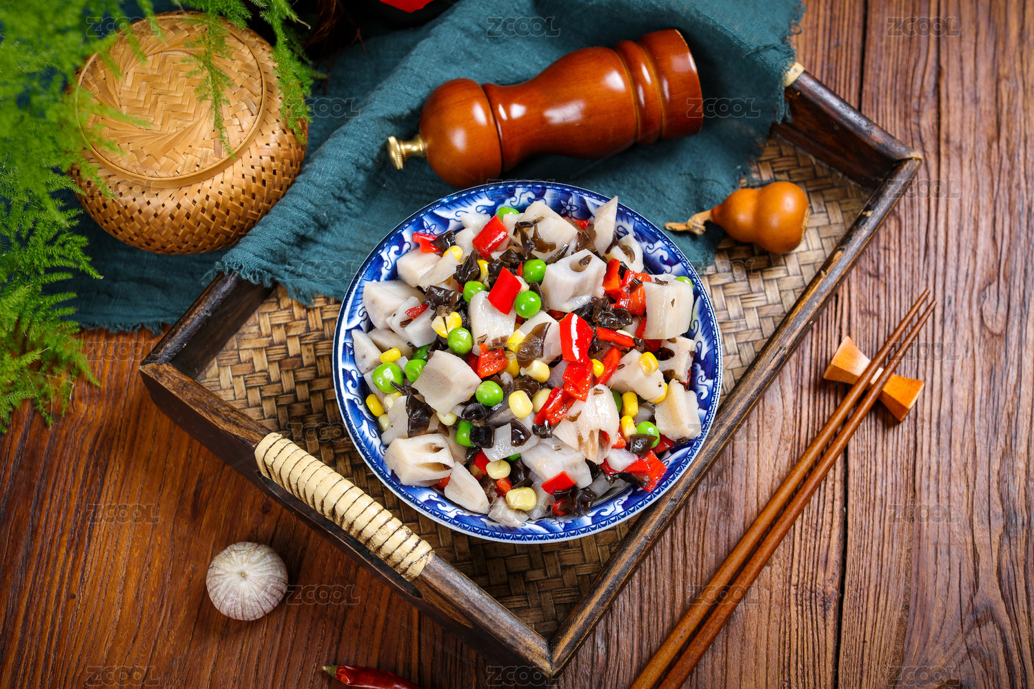 快餐外卖小吃美食豌豆玉米粒炒脆藕