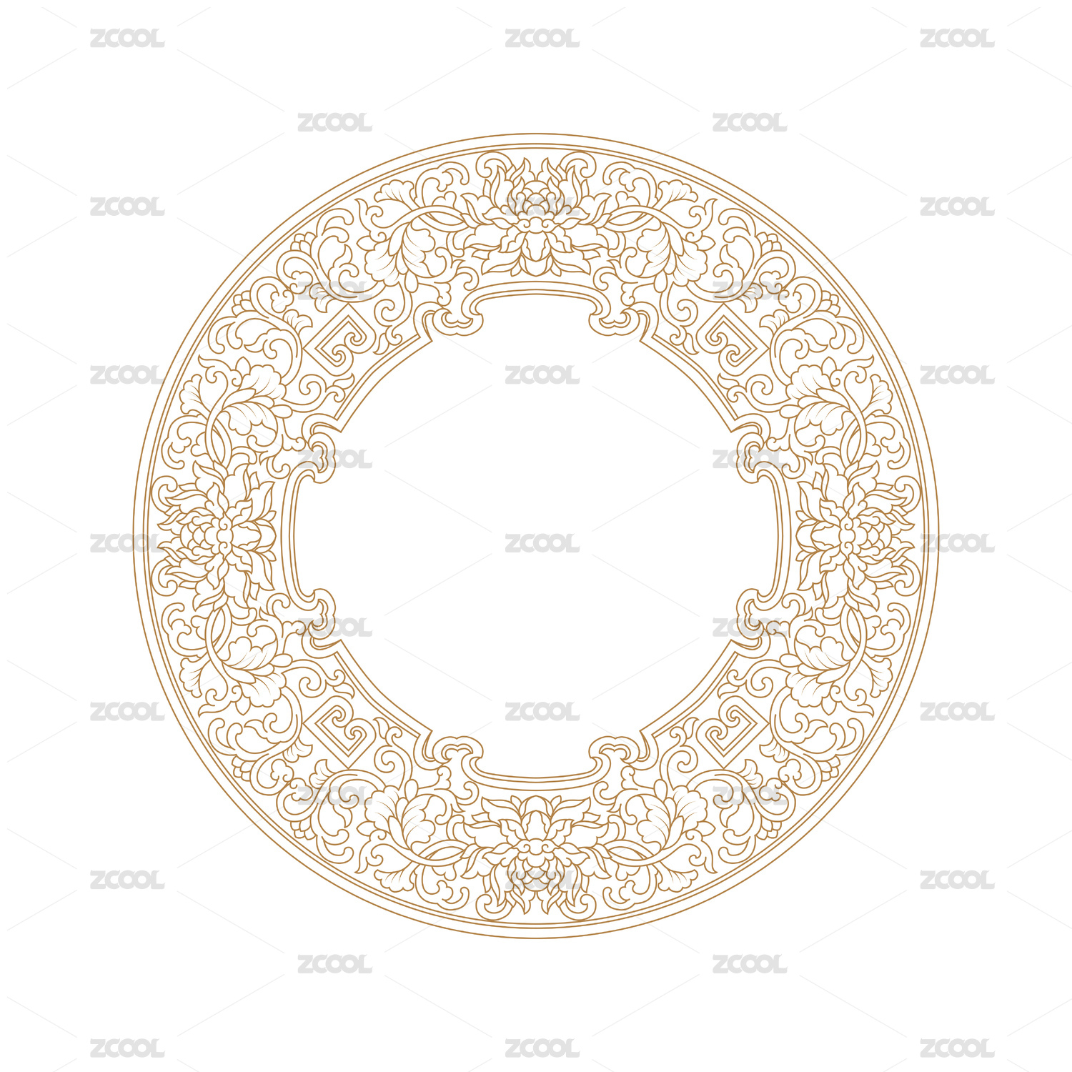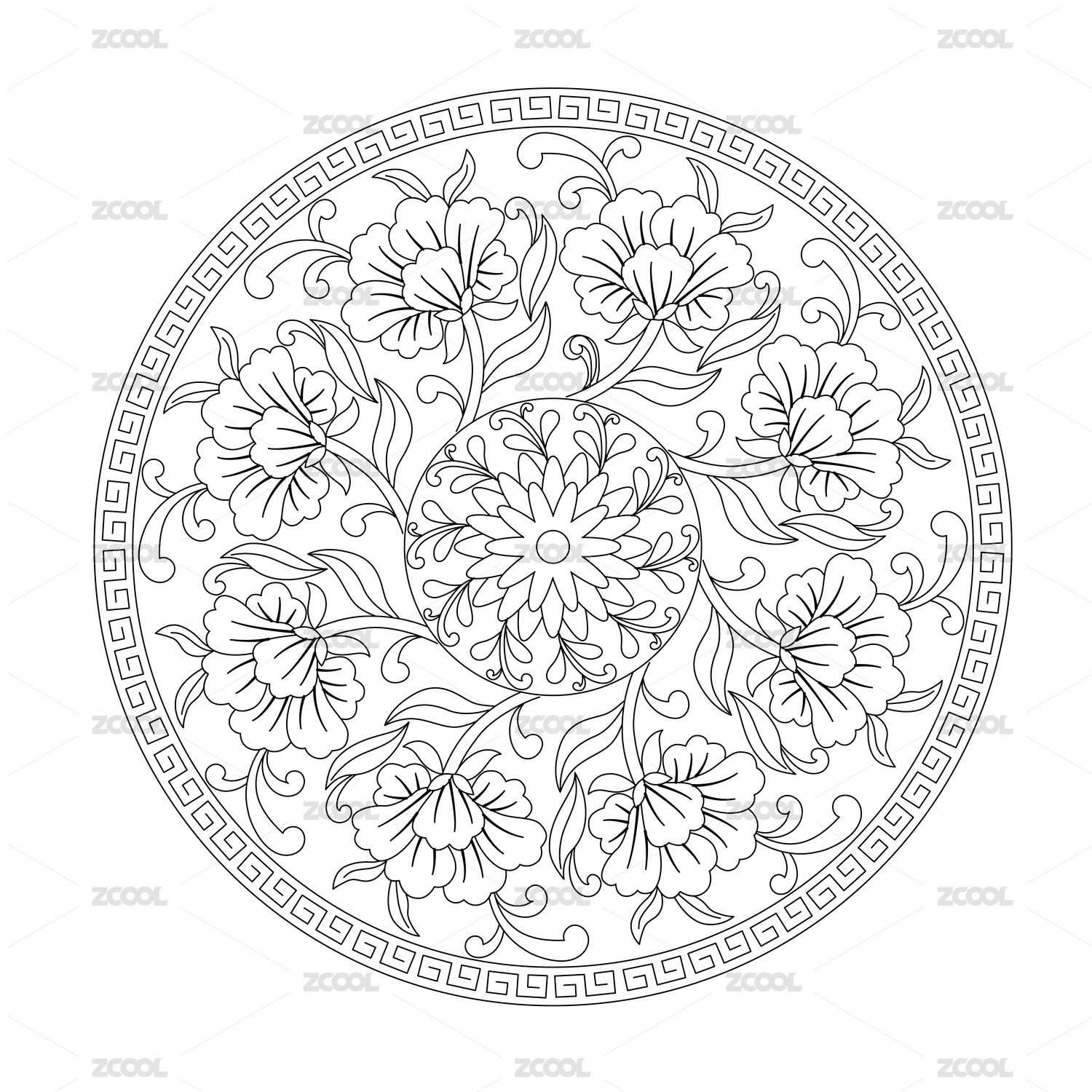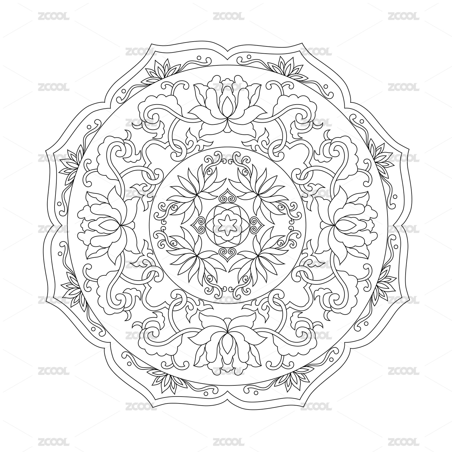 中国传统的莲花线条缠枝纹圆形图案,黑色线条平面图