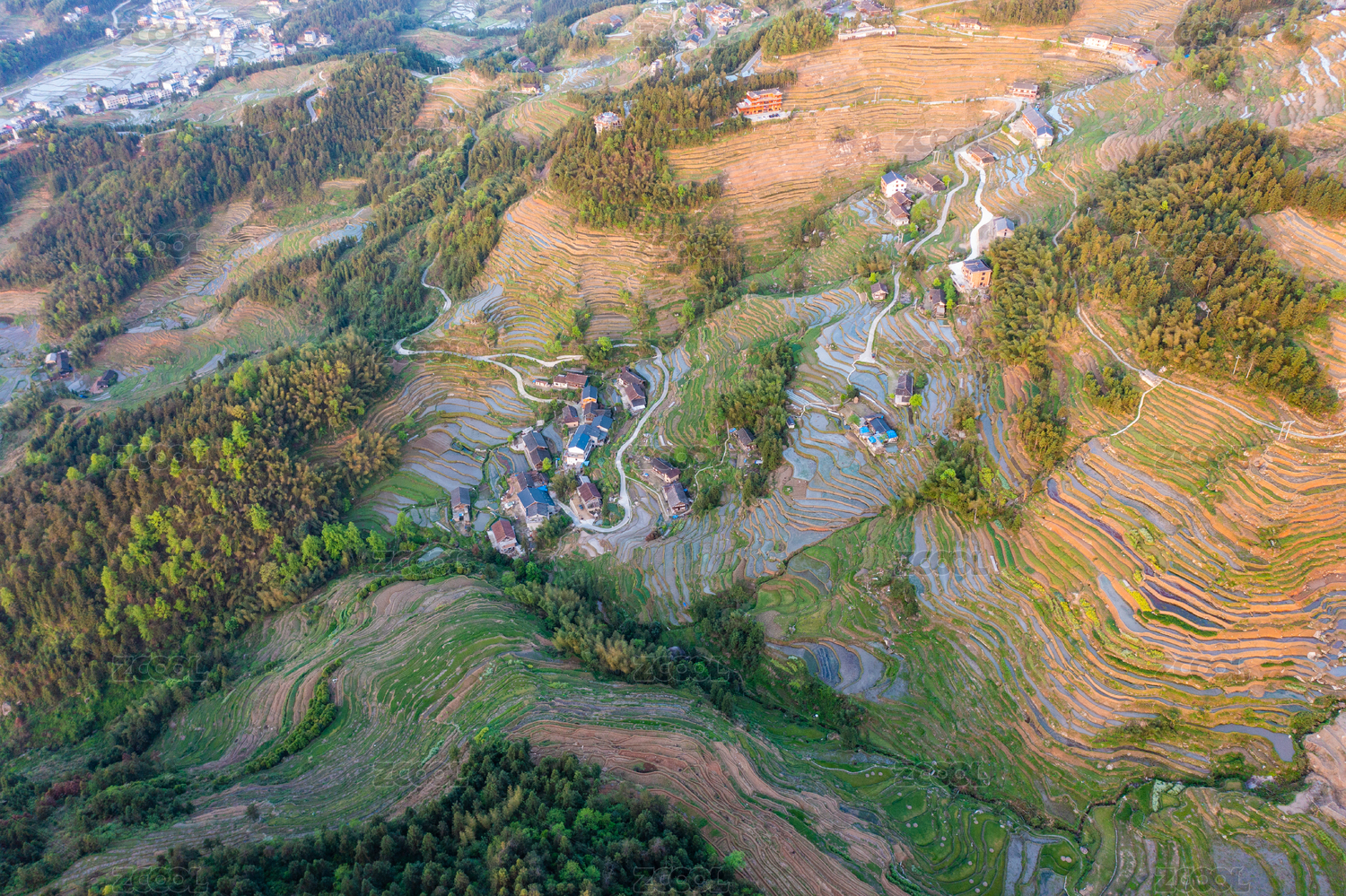 中国湖南小横垅金子山春耕时节的梯田航拍图