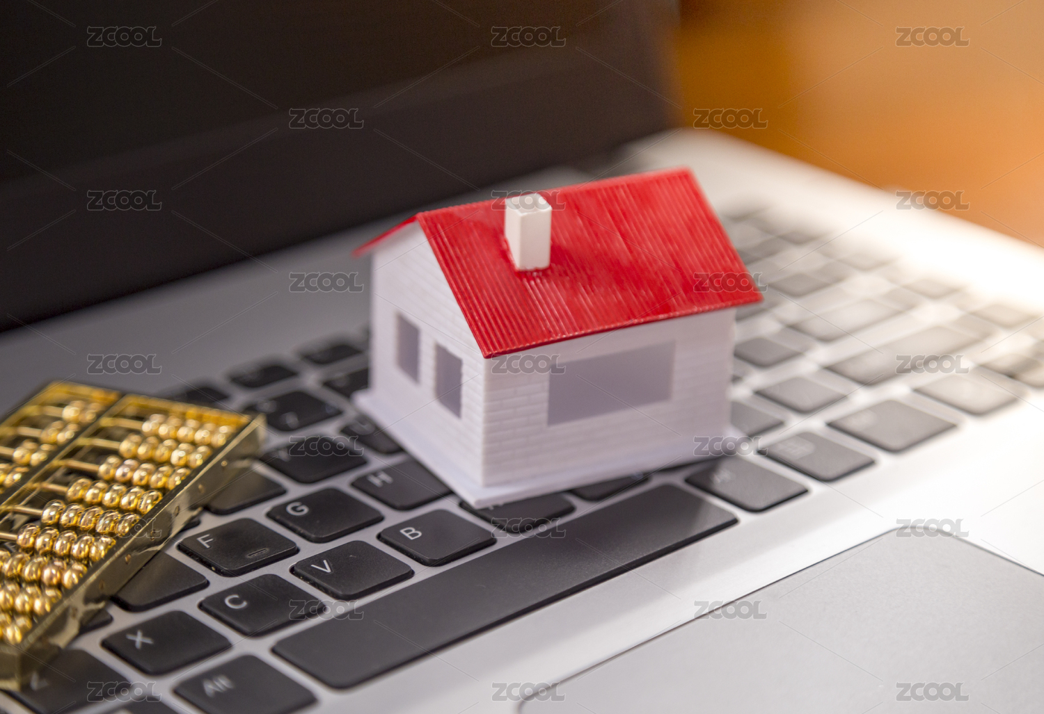 放在笔记本电脑上的算盘、钱币和小房子模型