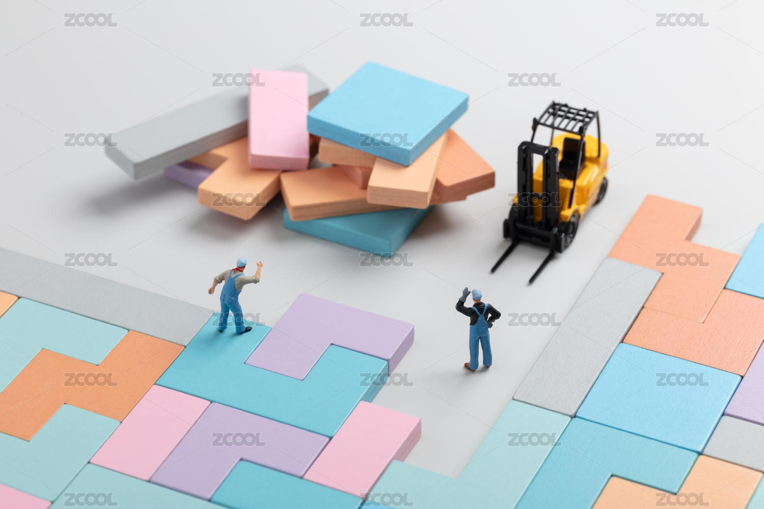 微缩场景工人挪开积木开辟道路