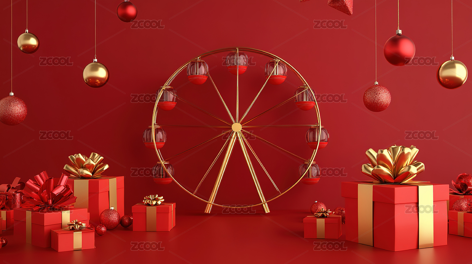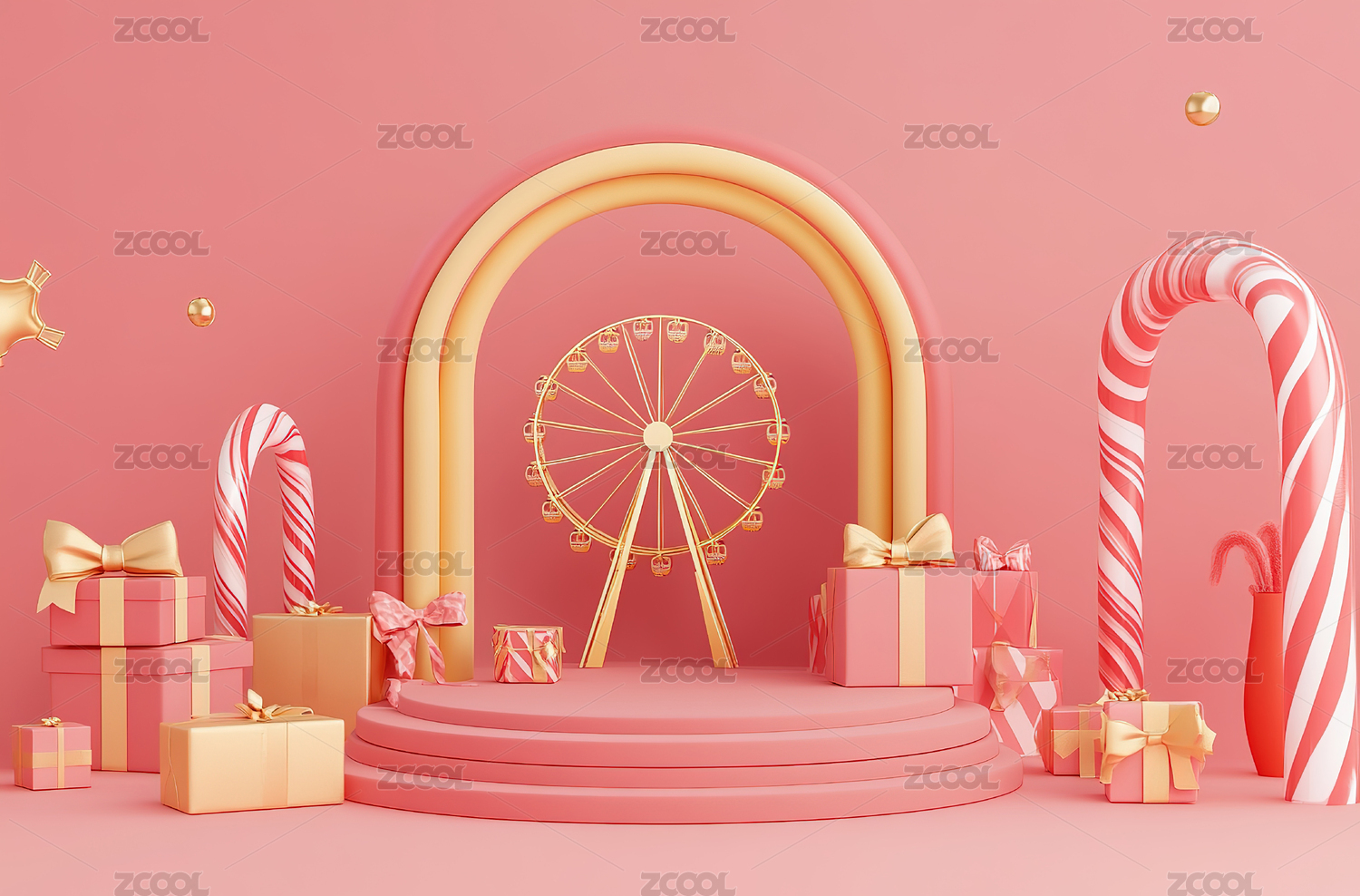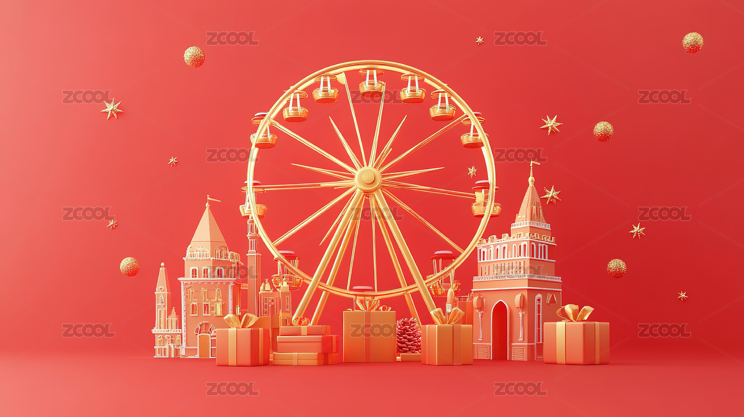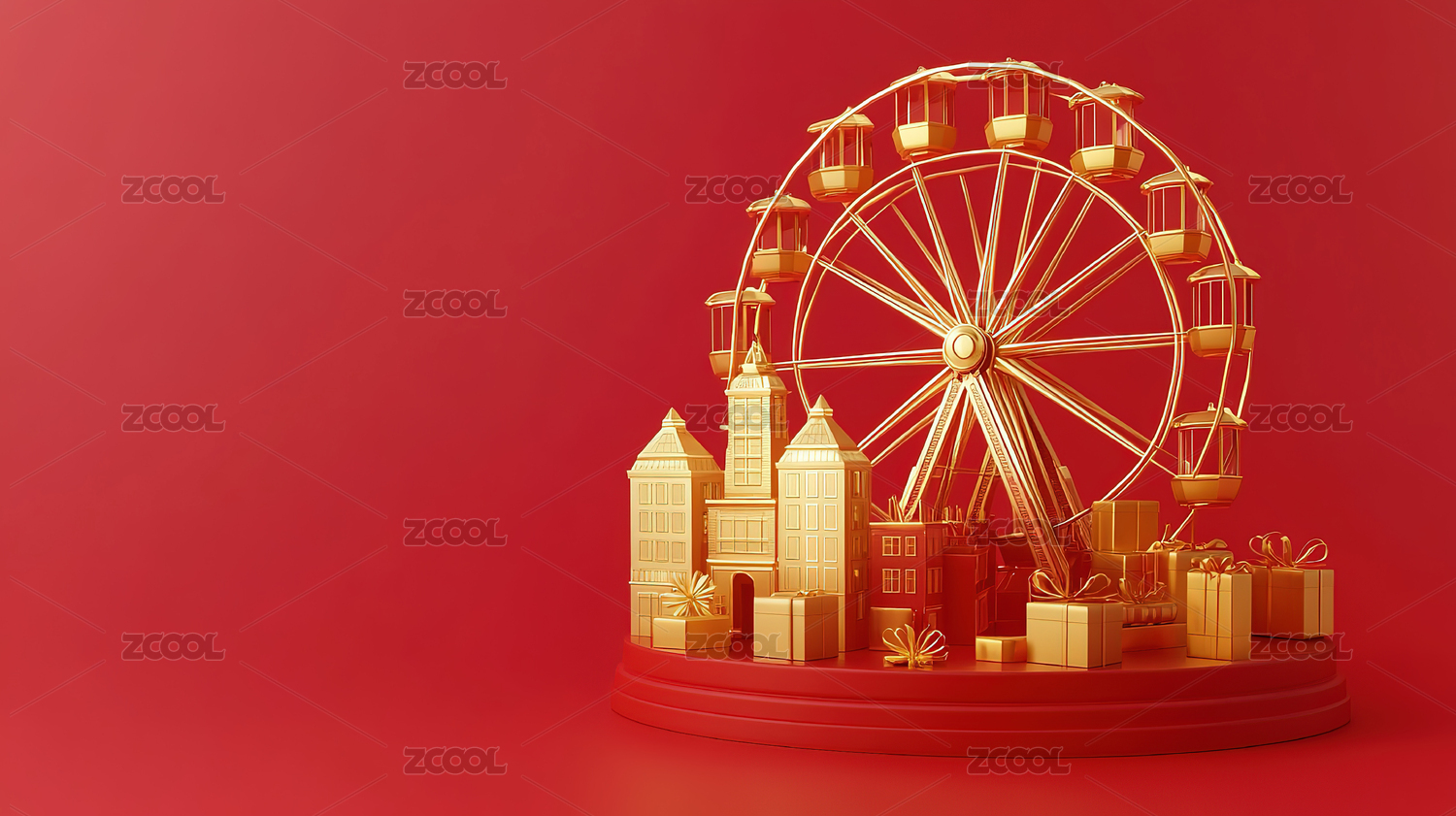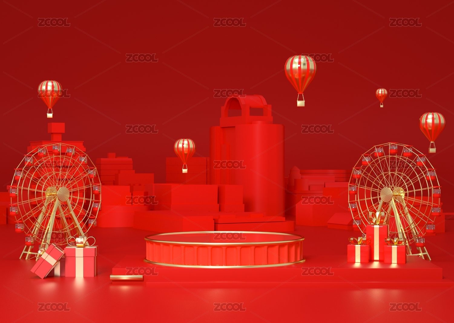 电商三维舞台场景城市背景红金摩天轮热气球节日背景