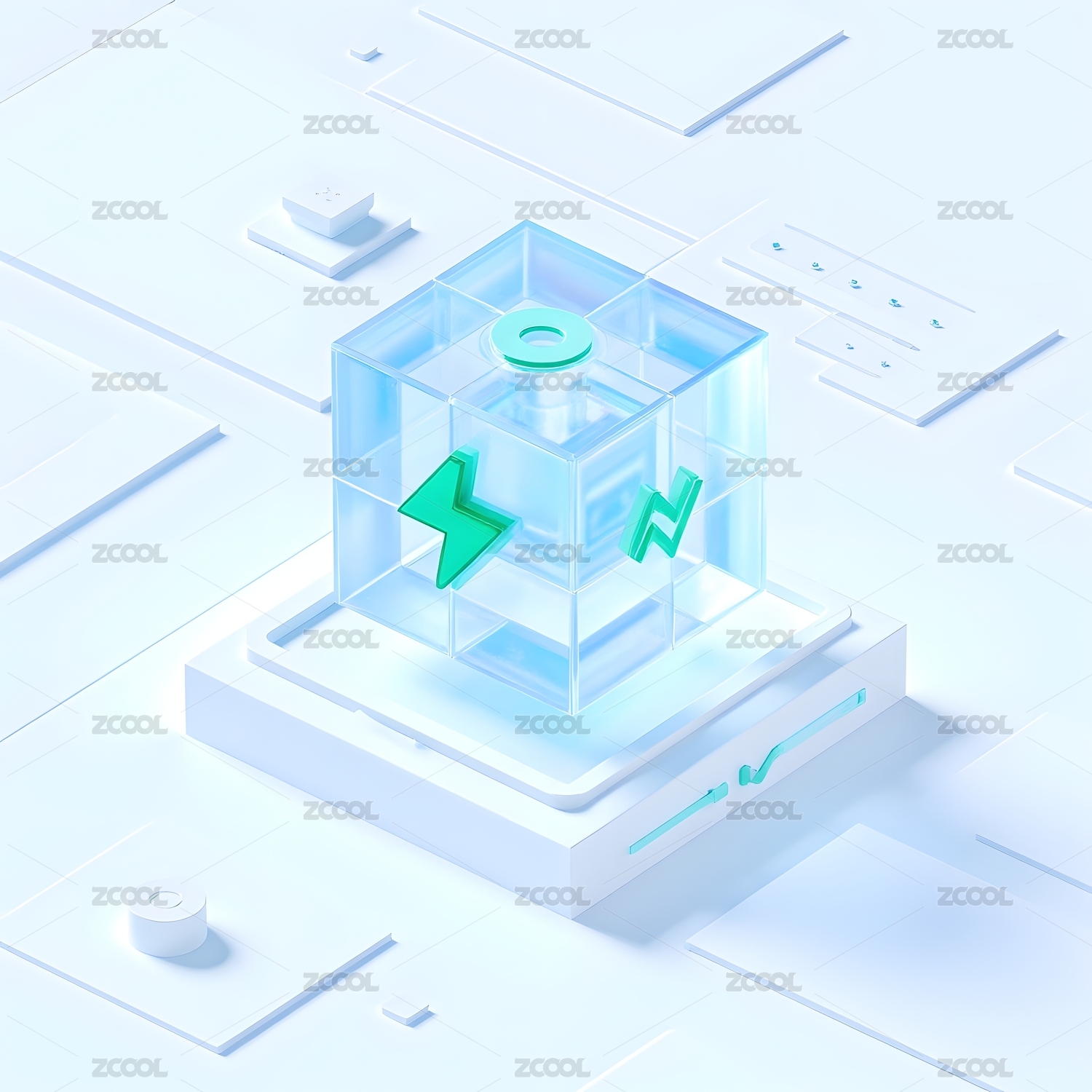 科技感透明立方体与绿色图标