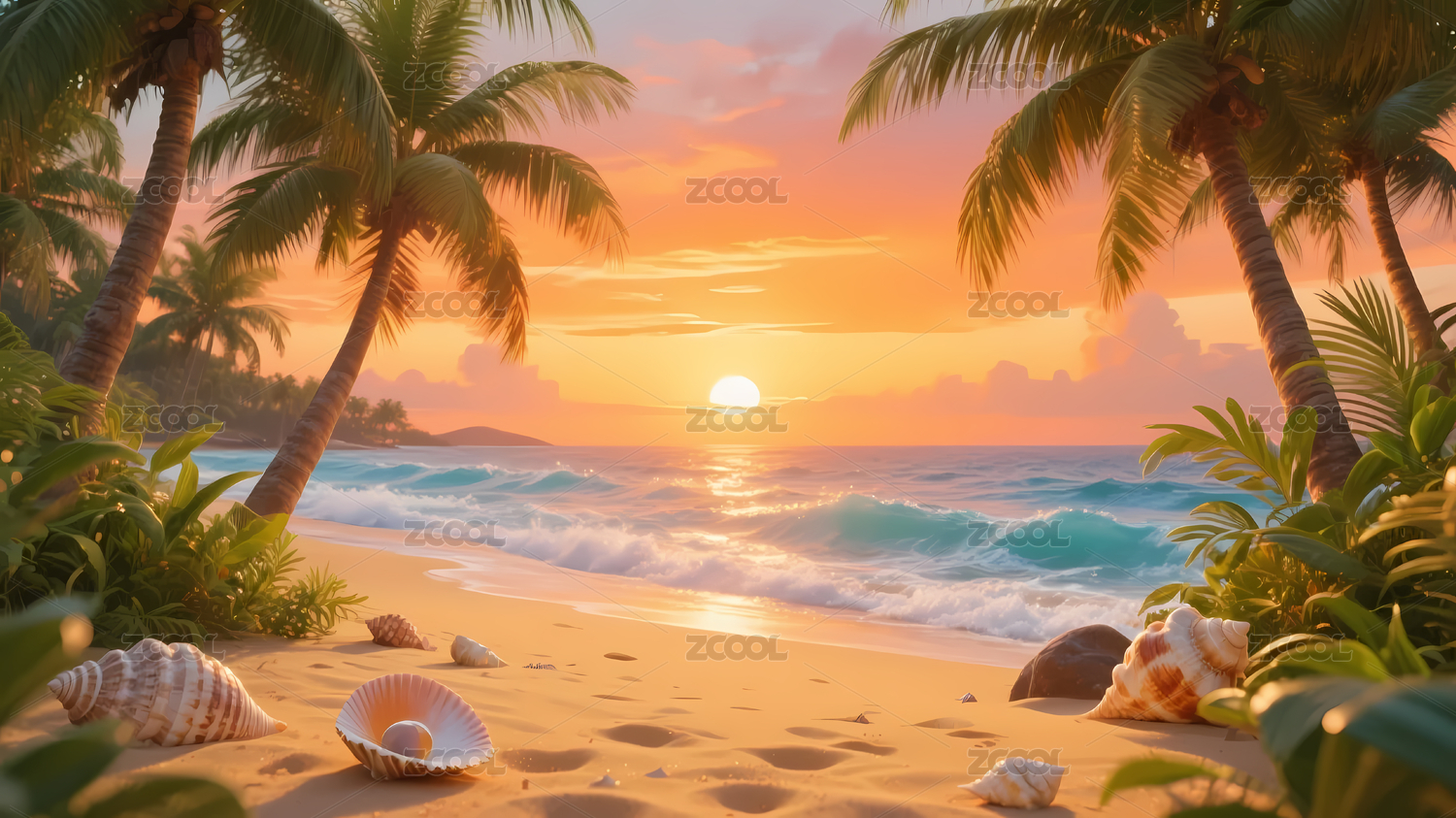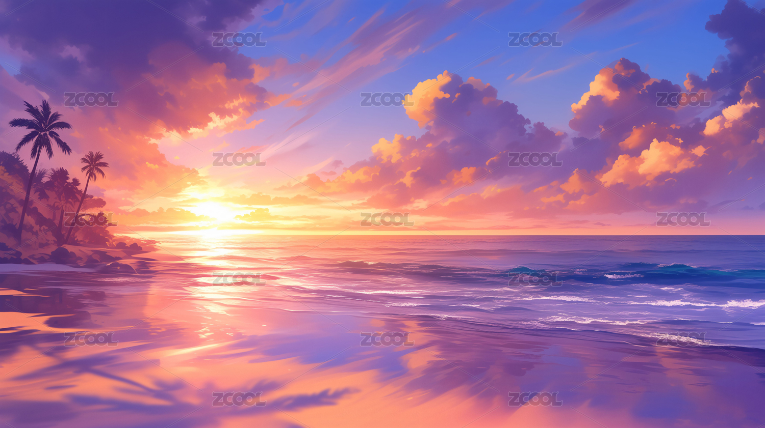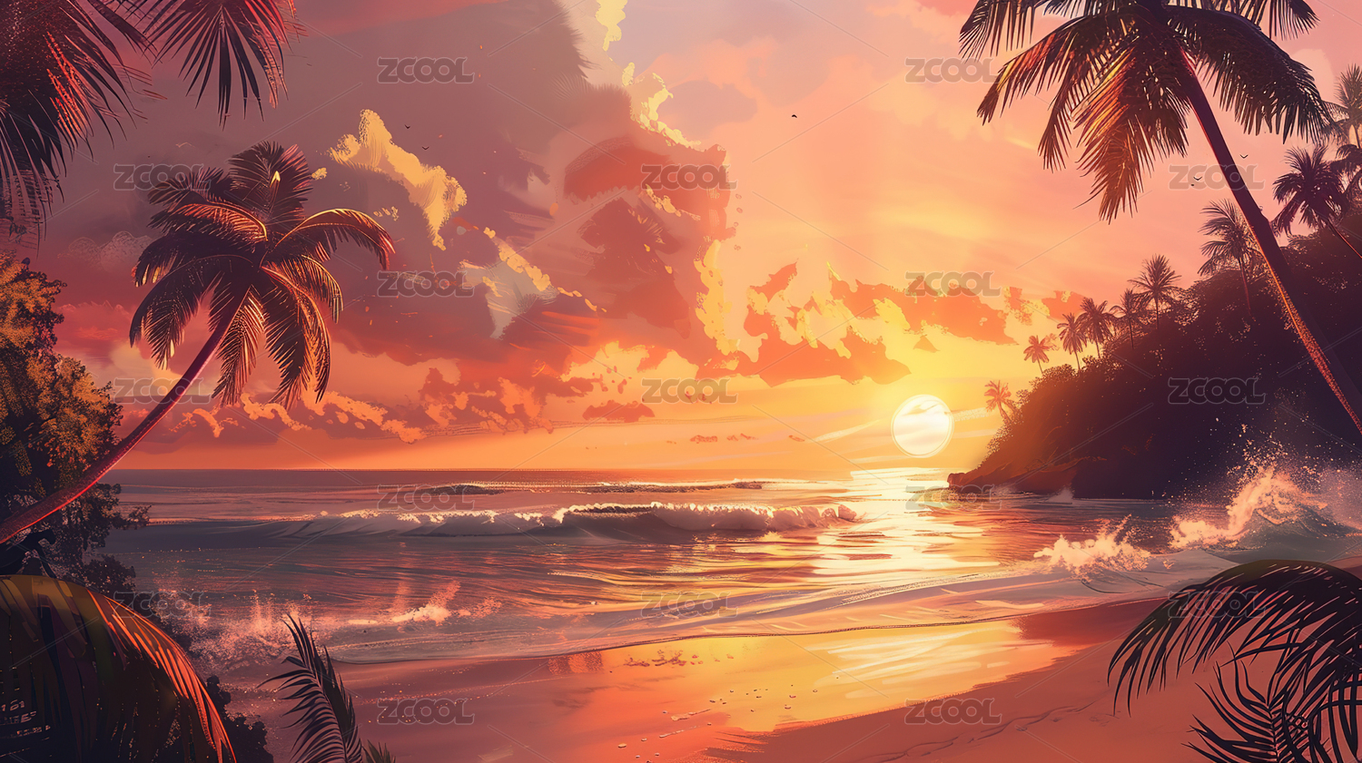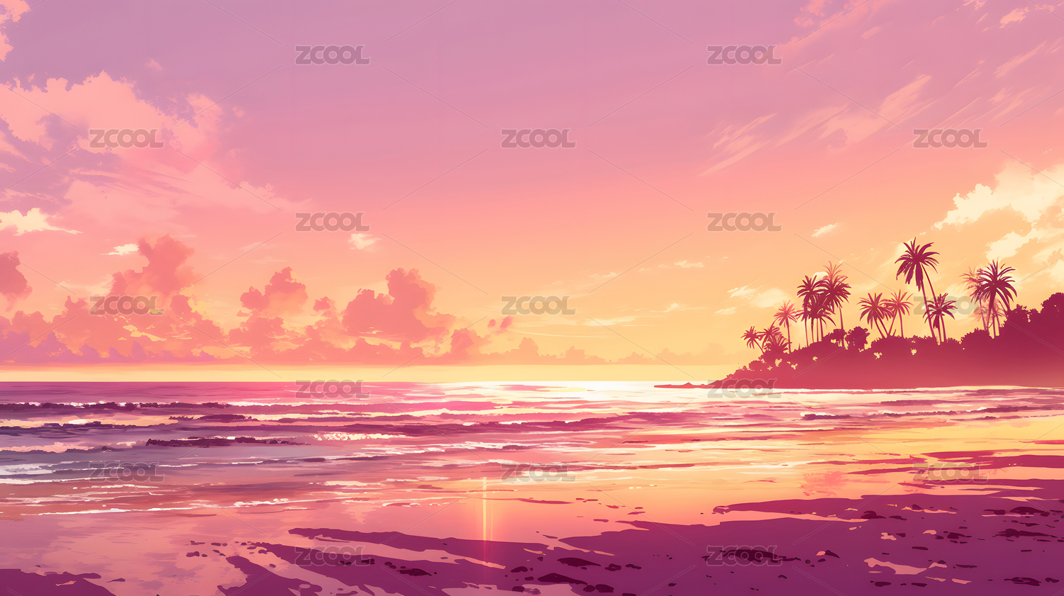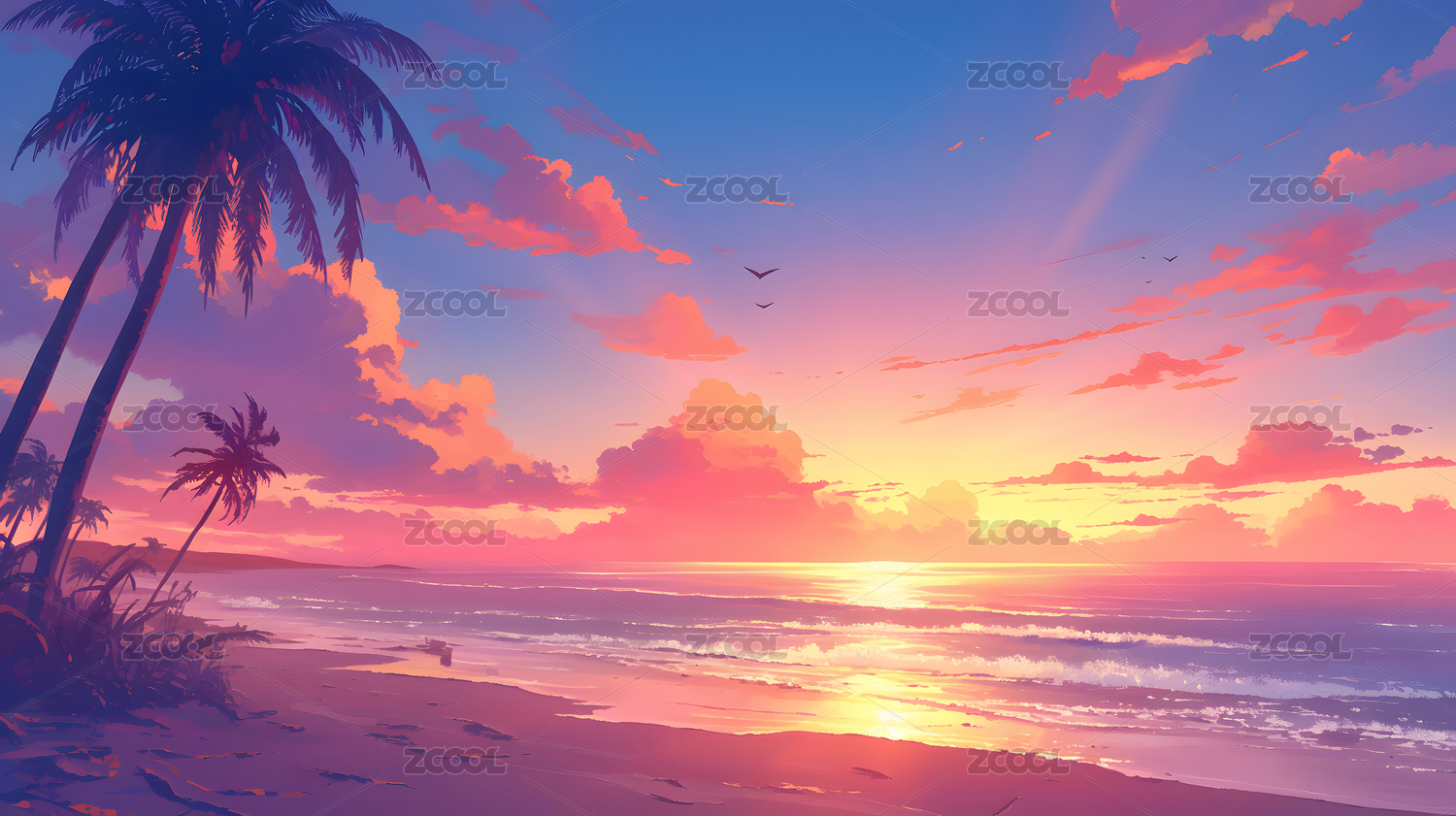 复古日漫自然风景海滩大海椰树落日夕阳户外