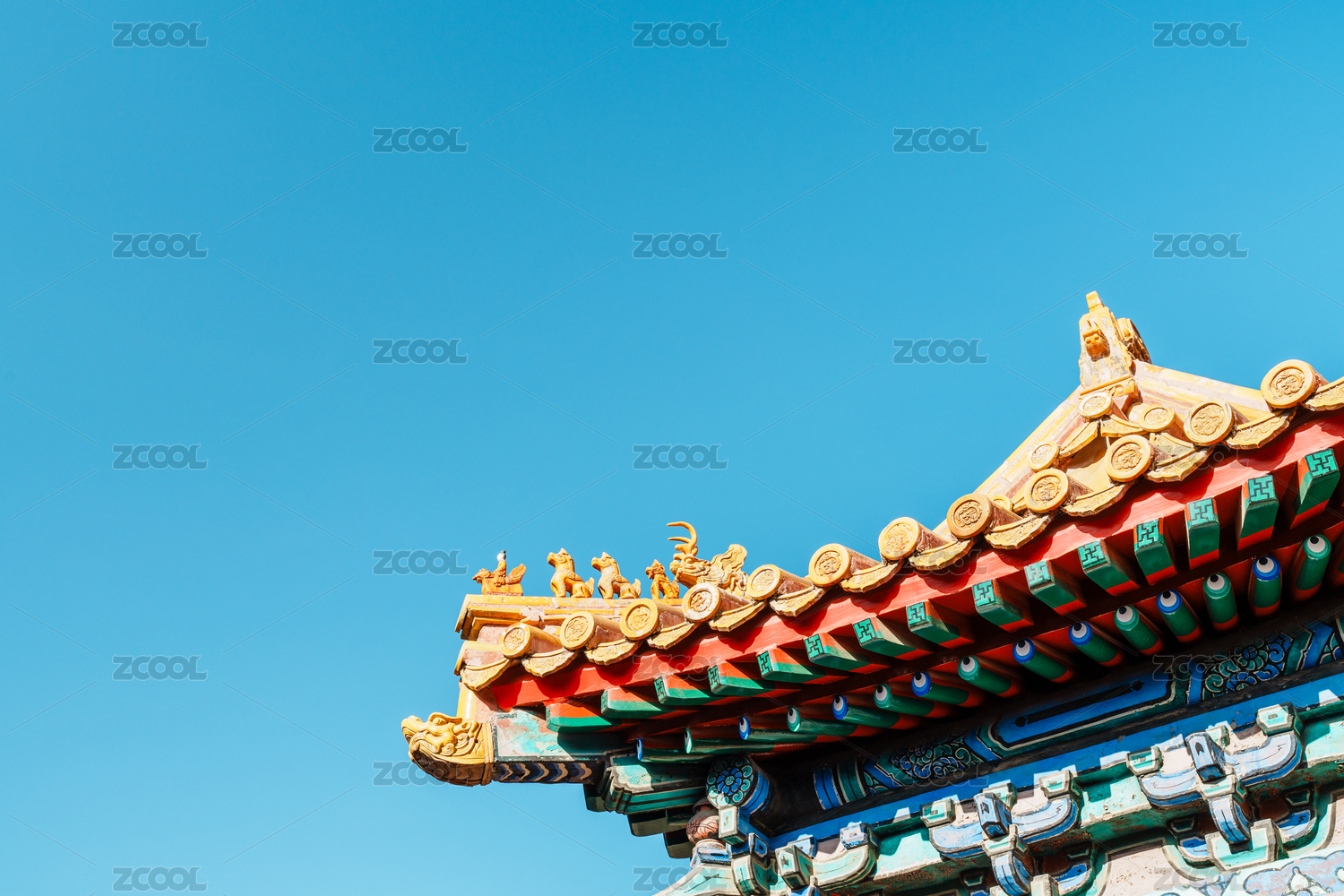 中国北京故宫博物院古建一角—琉璃瓦屋顶飞檐彩绘描金万字纹