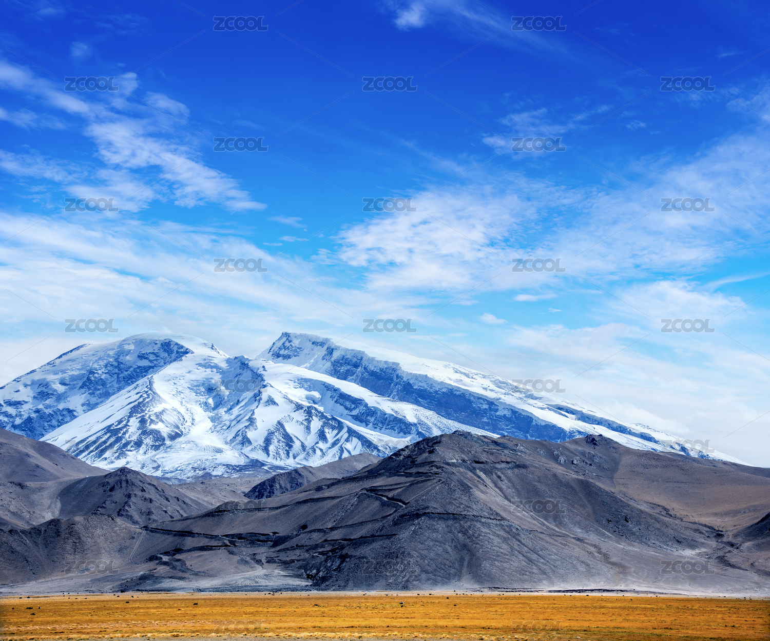中国新疆新疆南疆帕米尔高原蓝天白云背景下雪山草原壮丽自然风光