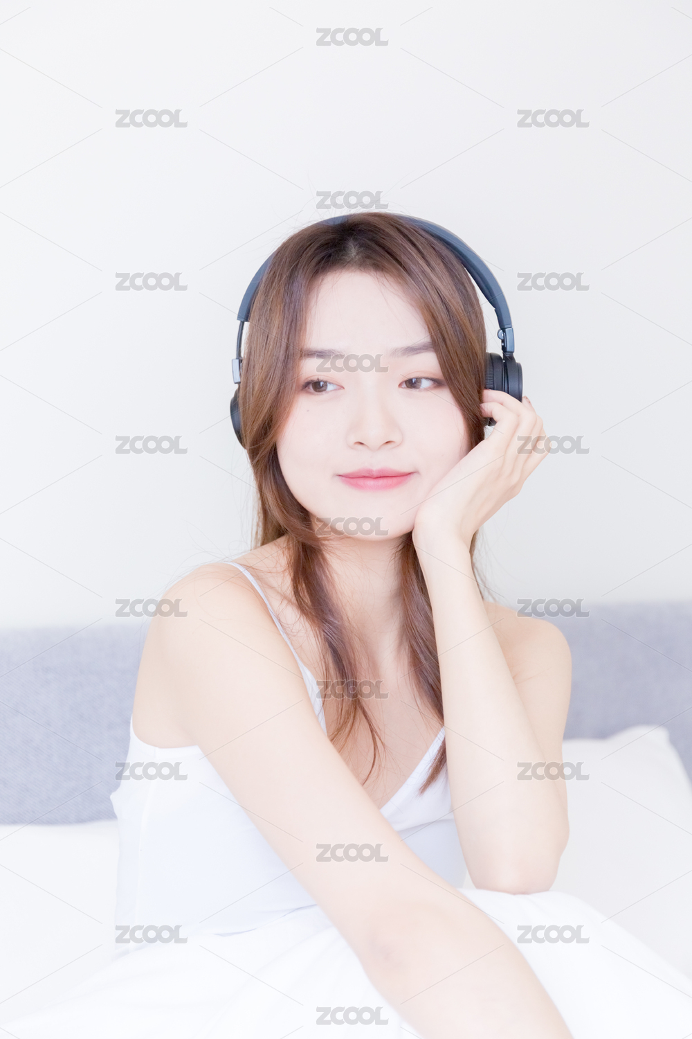 一名年轻的亚洲女子坐在床上用无线头戴耳机听