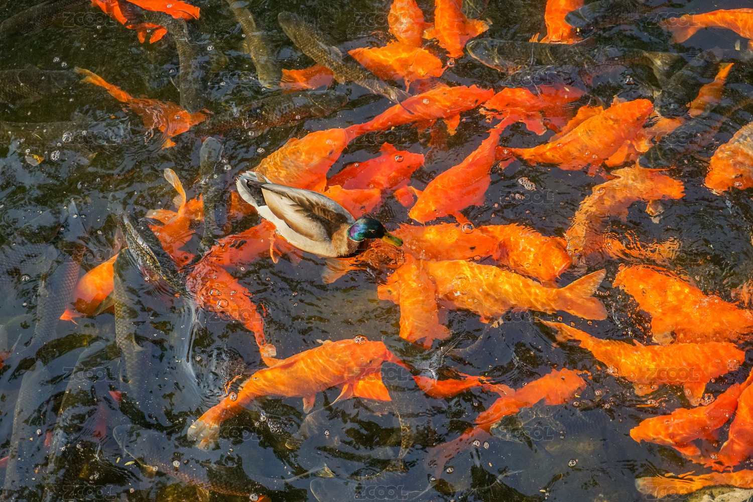 夏天锦鲤和金鱼在鱼池里欢快的游动