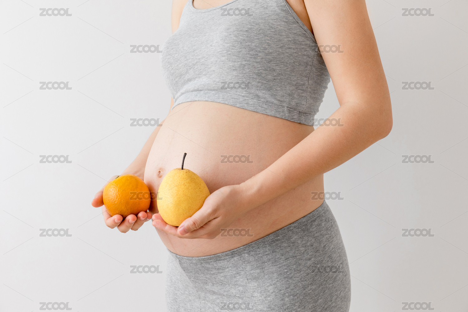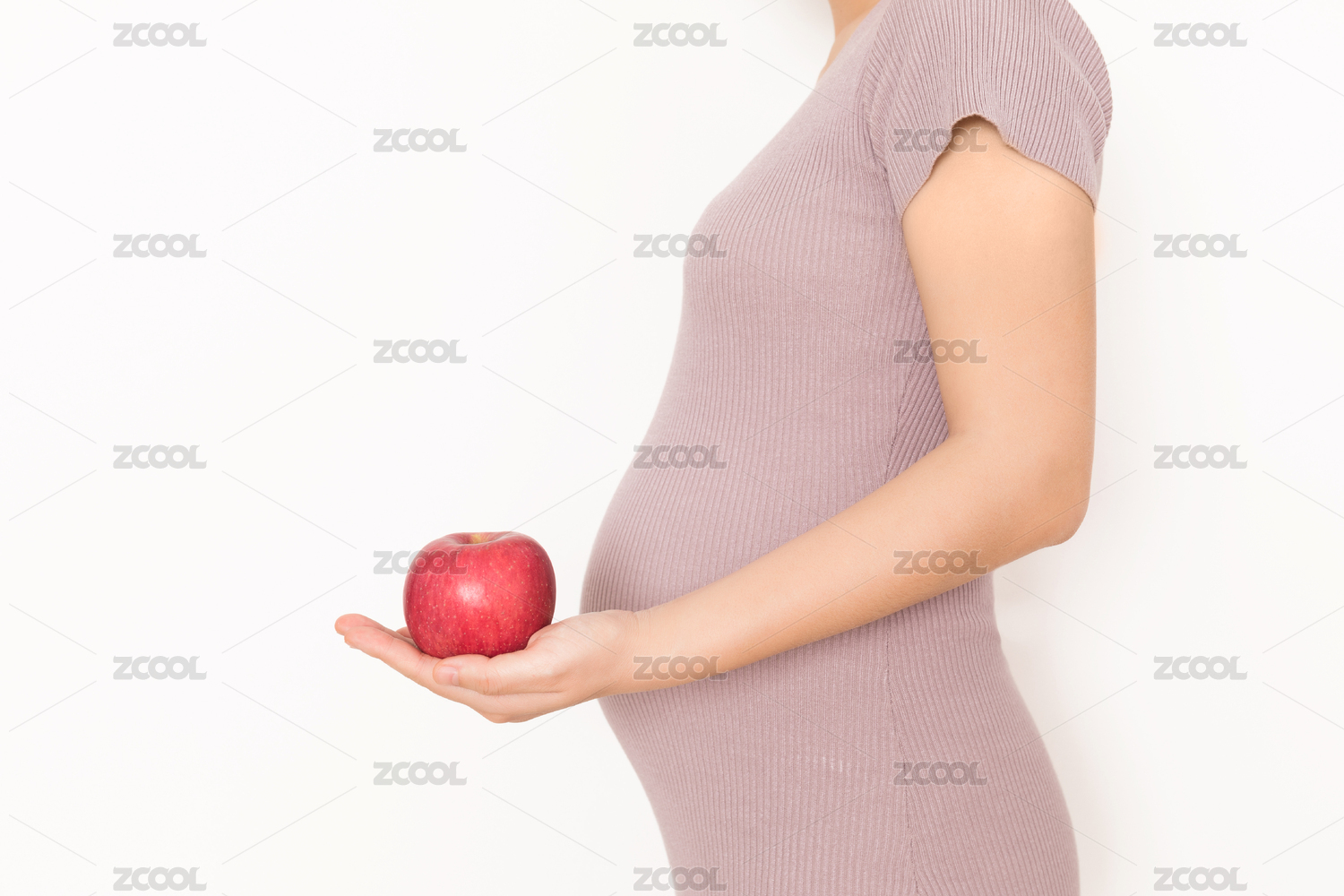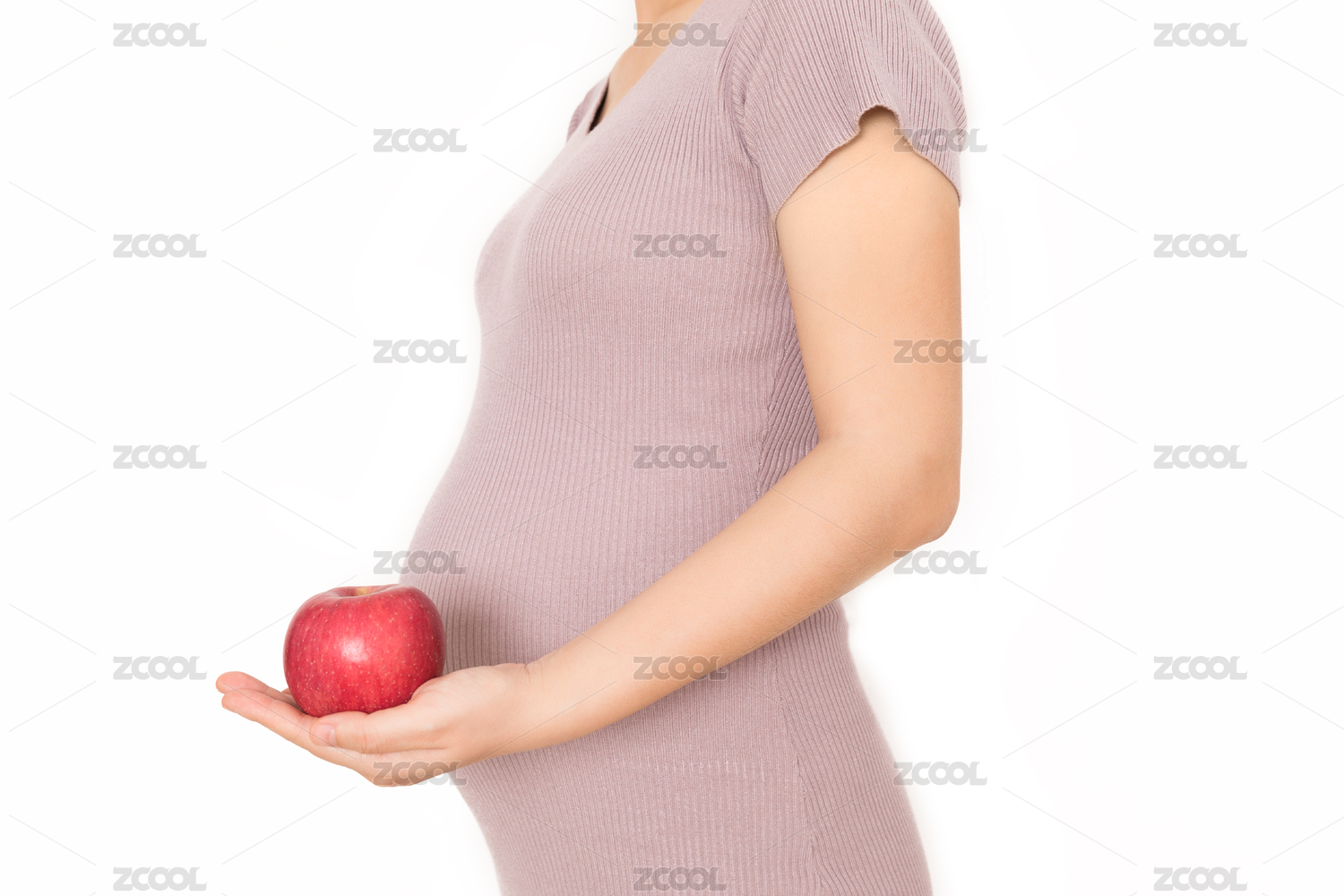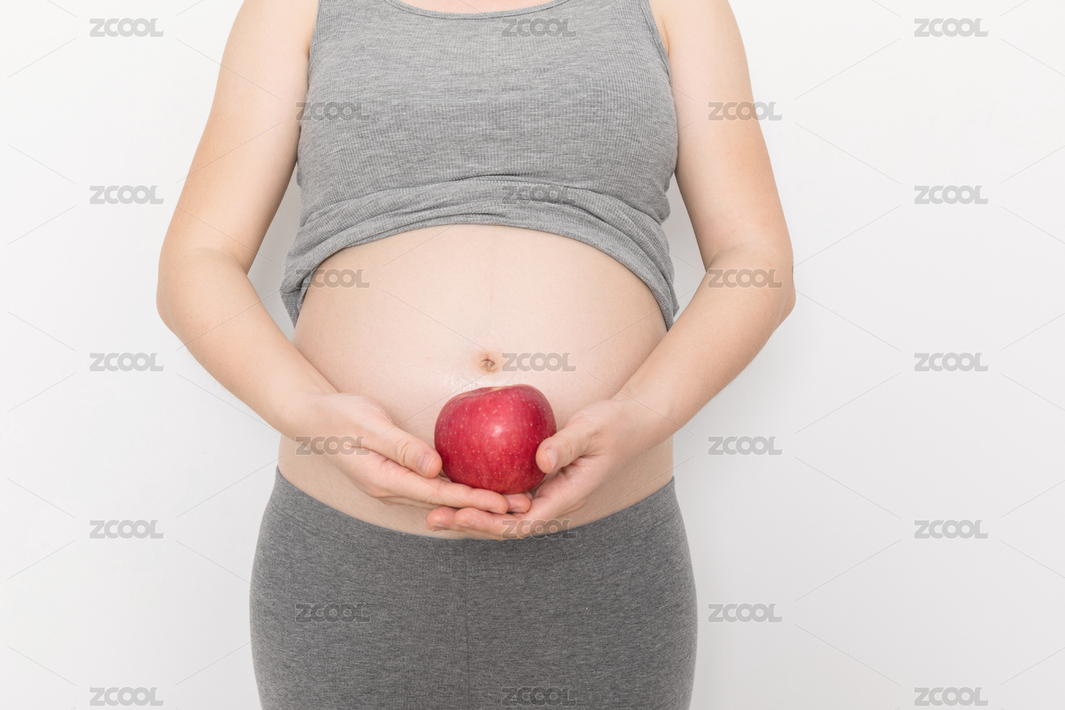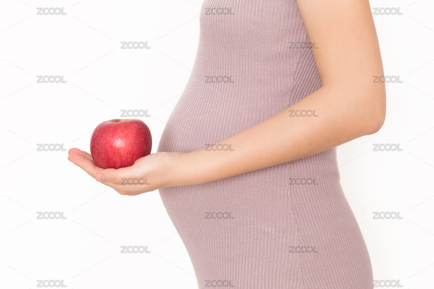 年轻的孕妇手上端着一盘苹果和吃着苹果