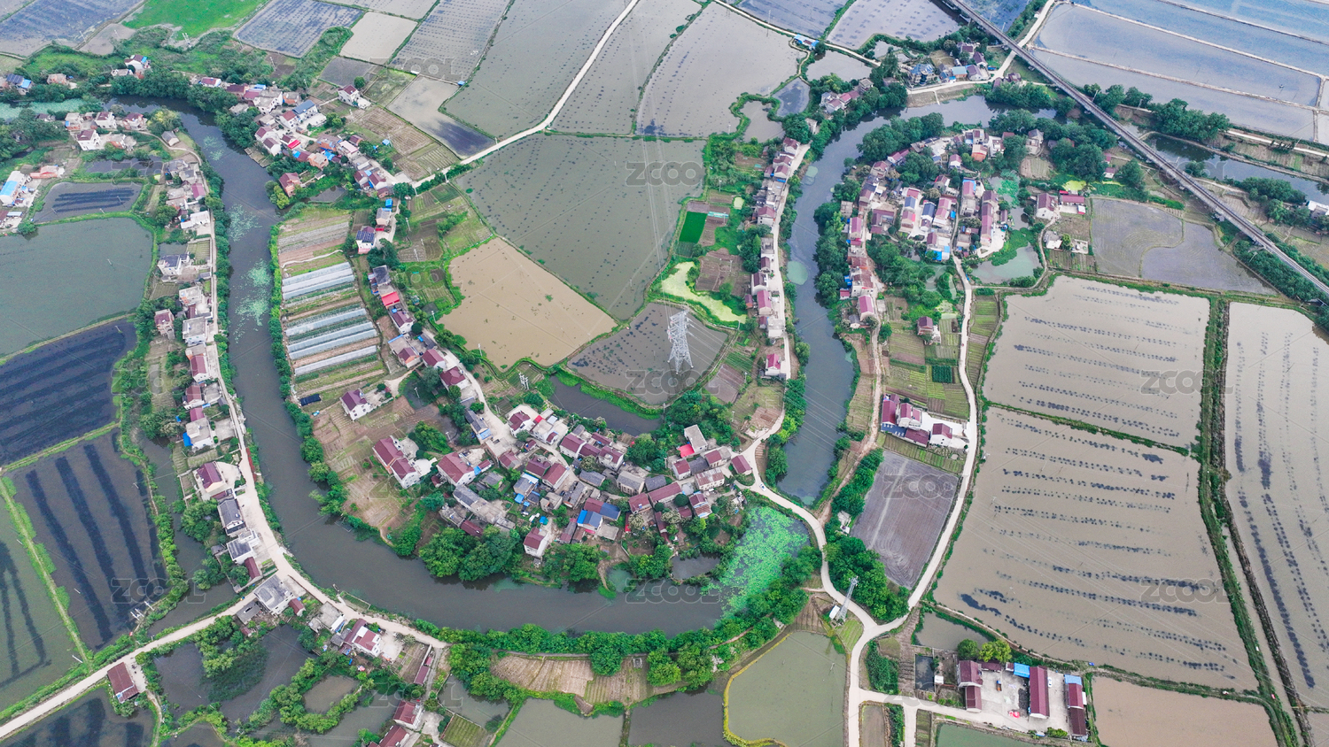 航拍初夏时节蜿蜒小河及绿色田园风光