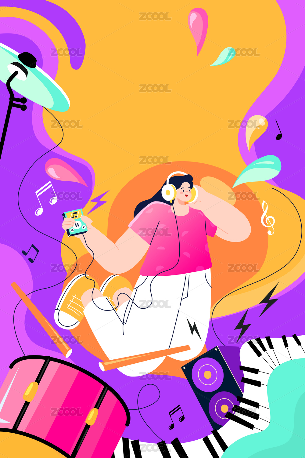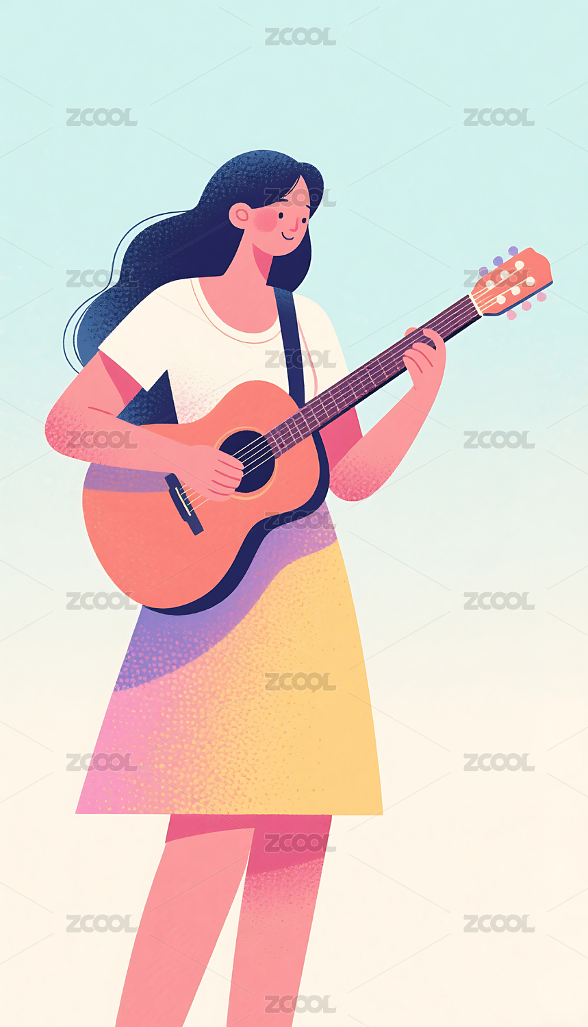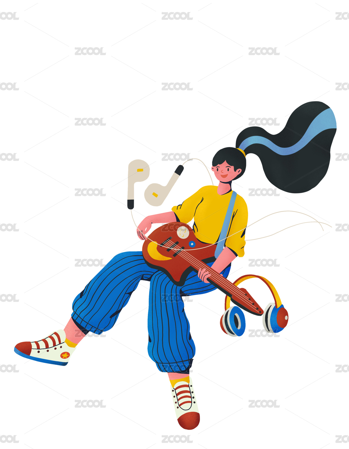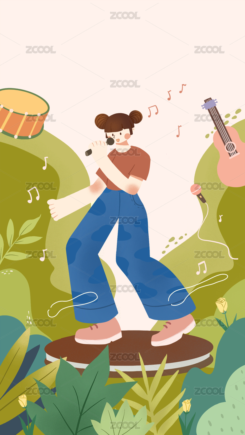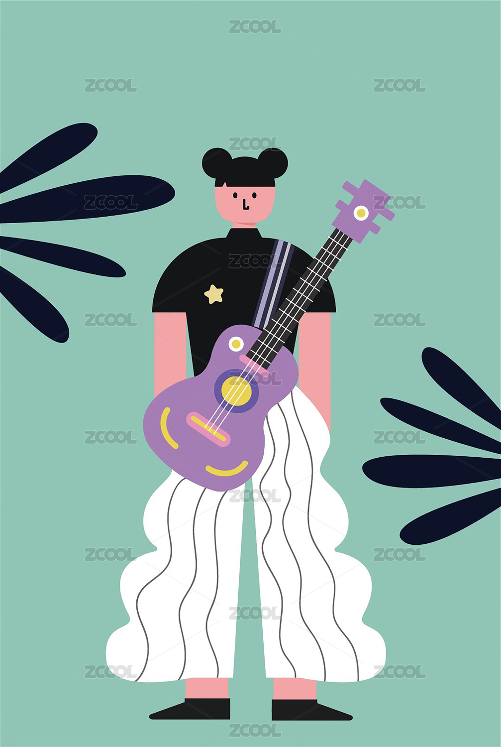 时尚少女弹着吉他在唱歌花草音乐节插画
