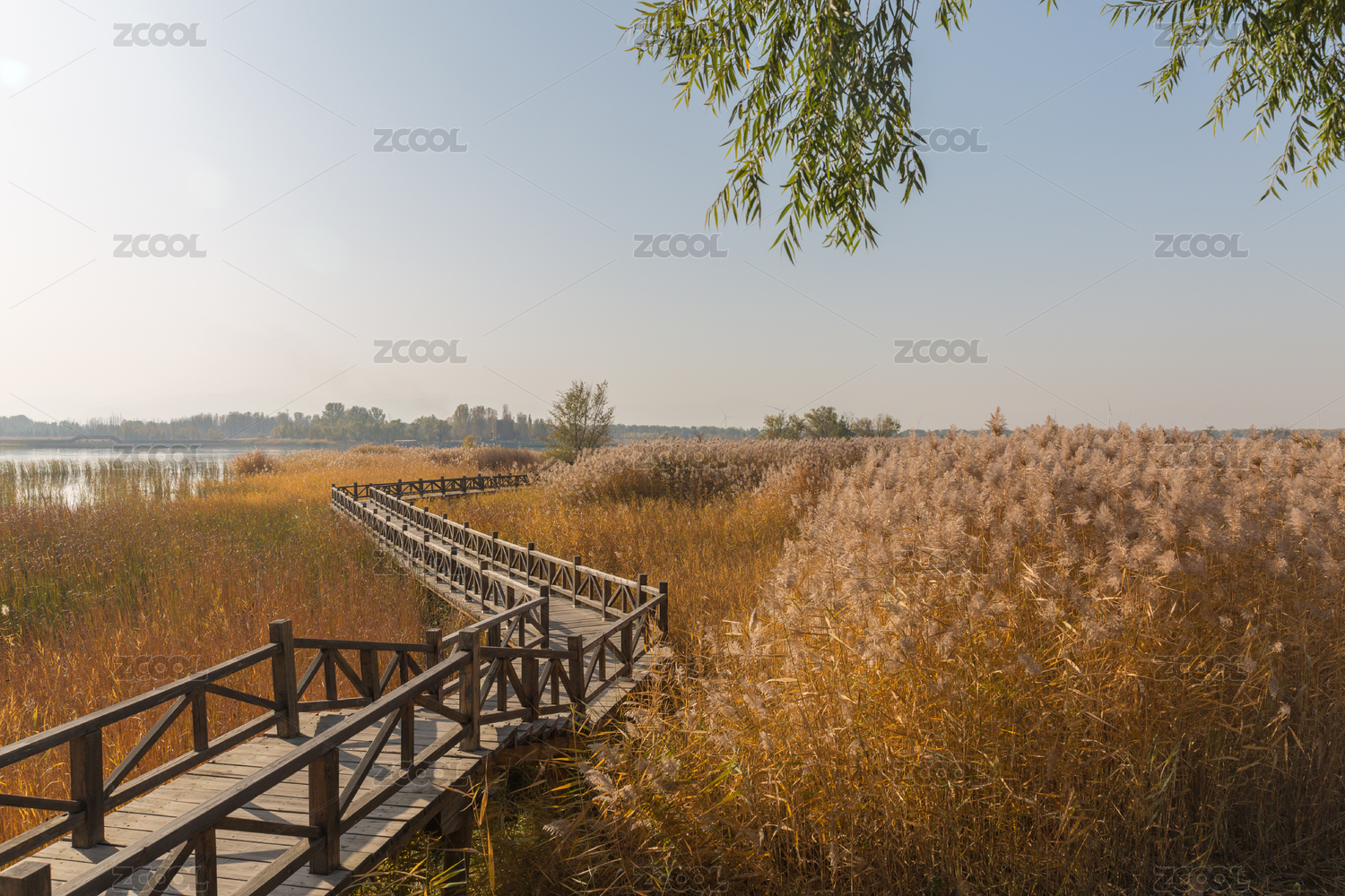 木栈道和两旁秋天的芦苇