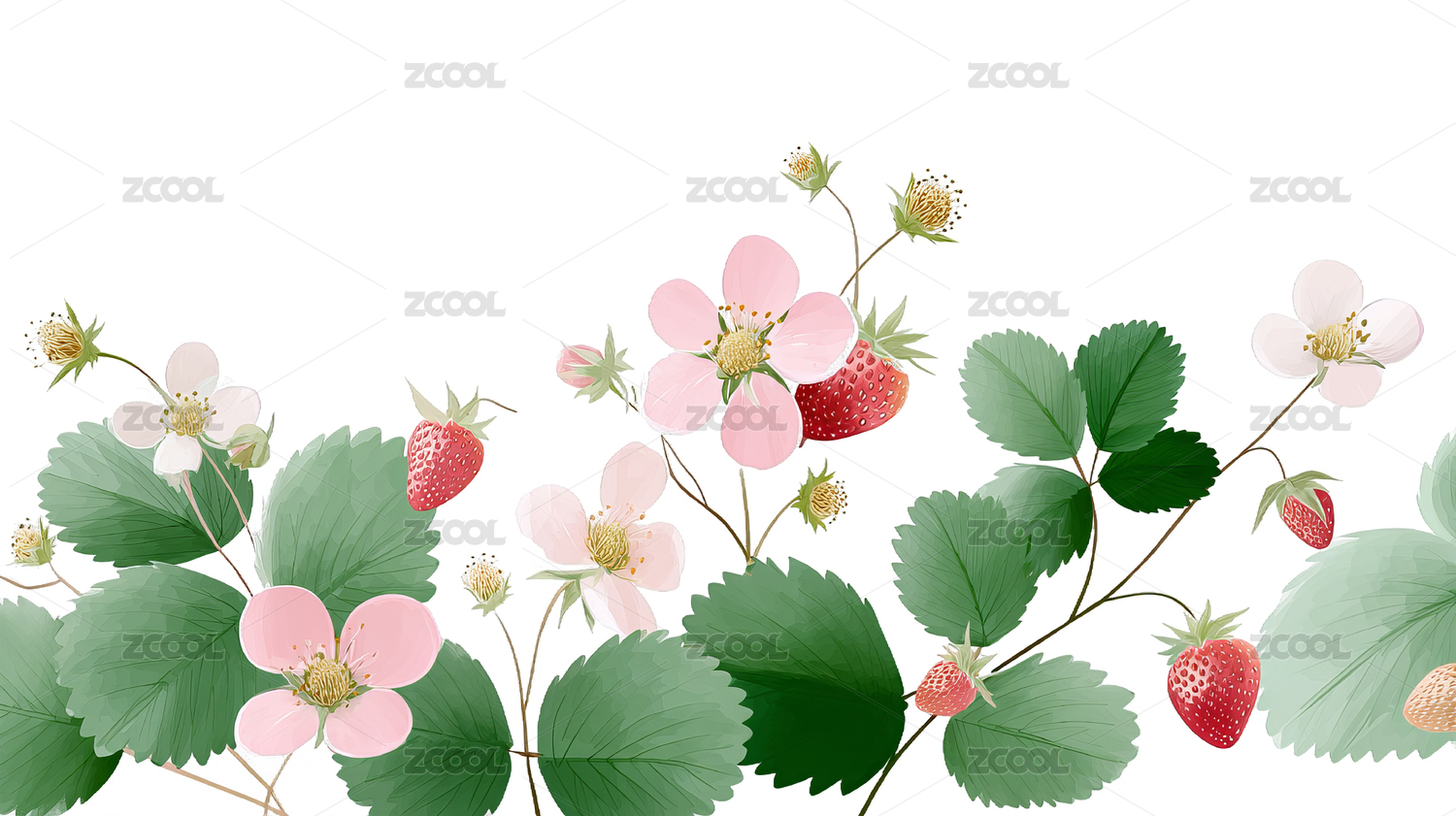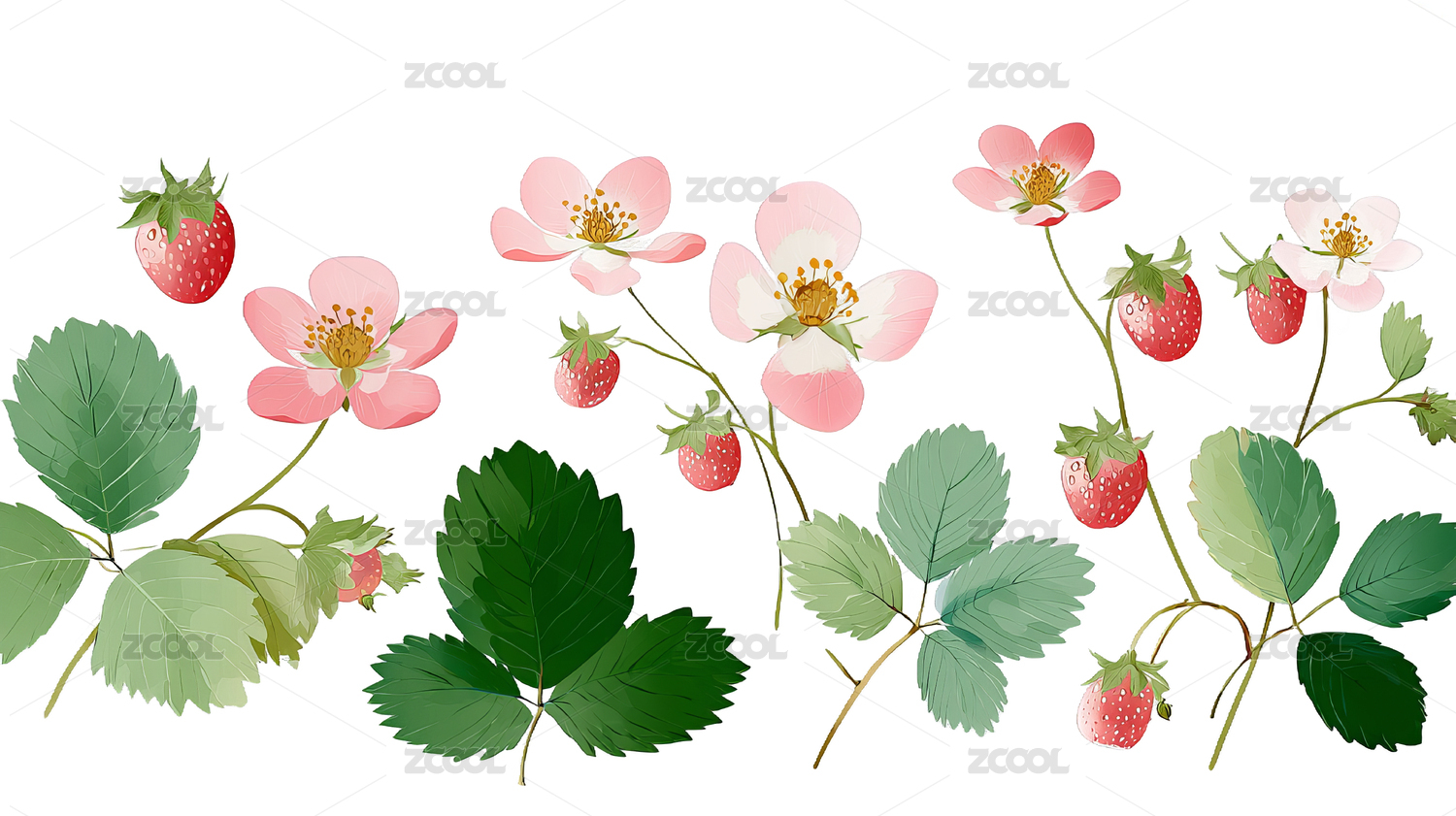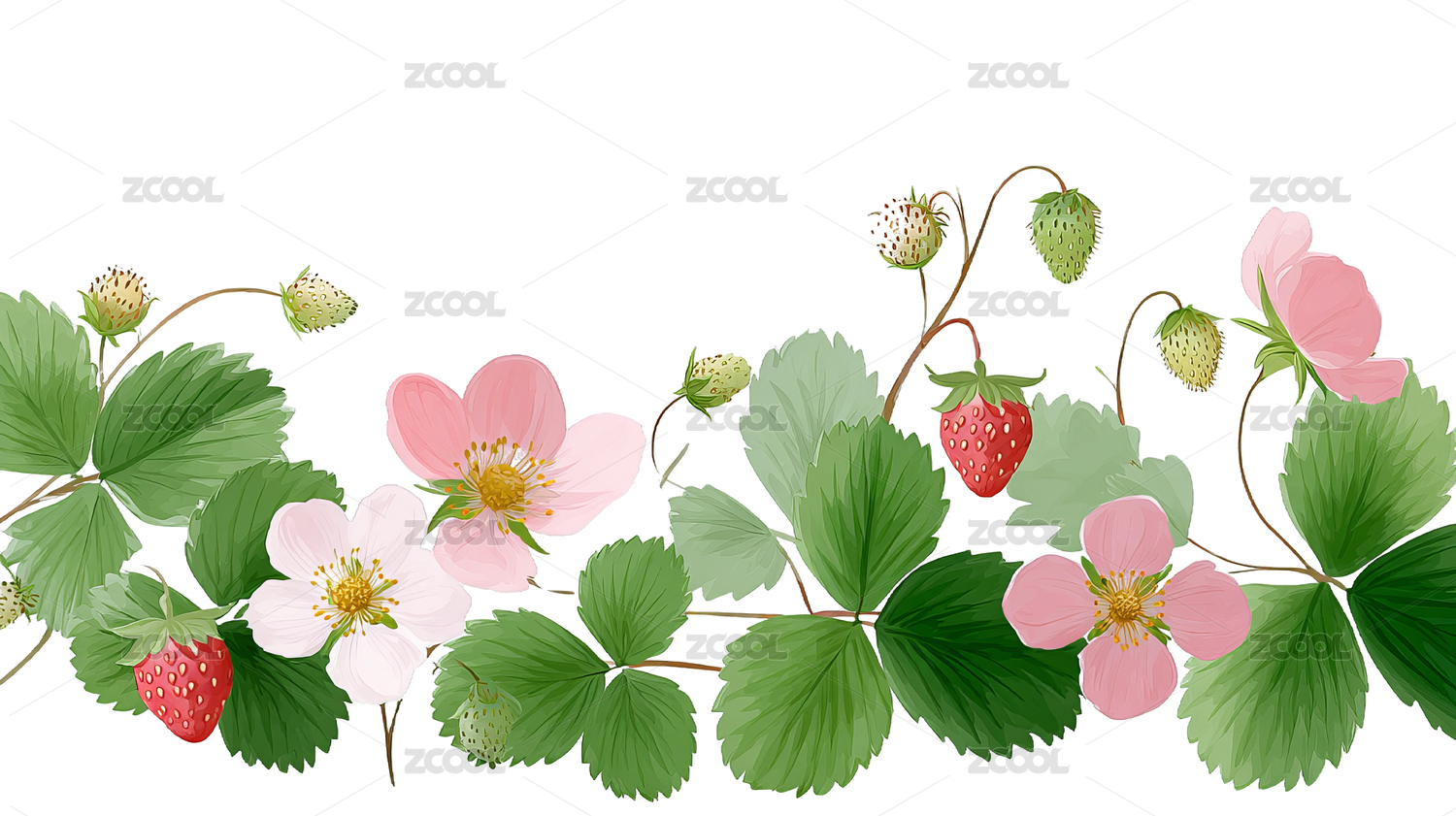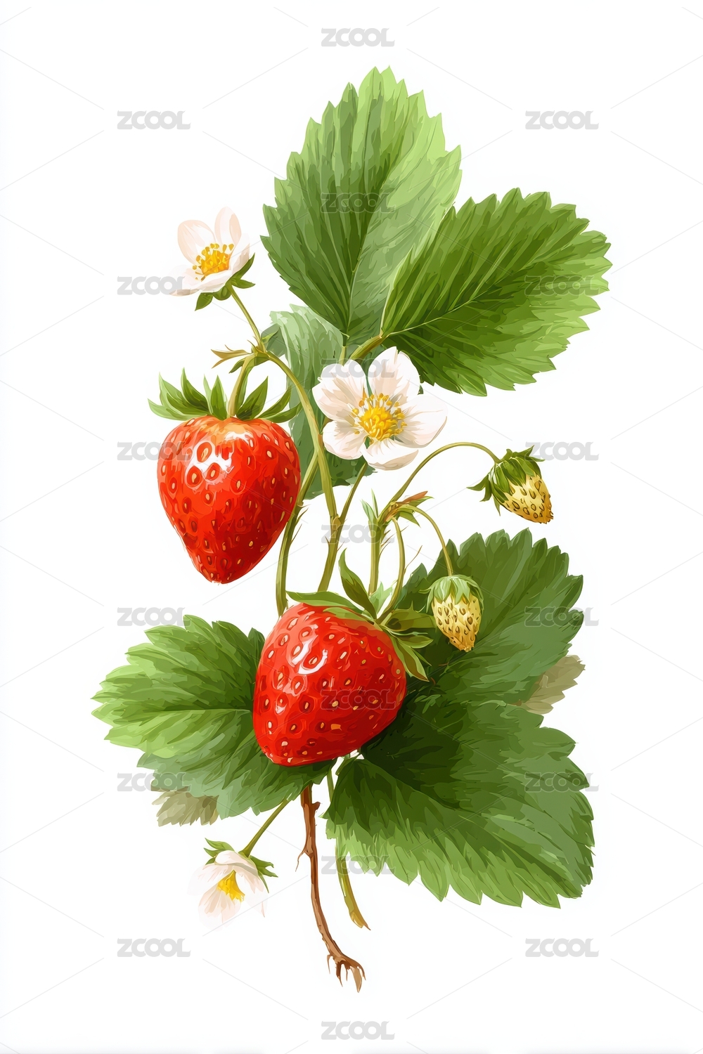 白底手绘草莓插图,茎上长出绿叶和花朵