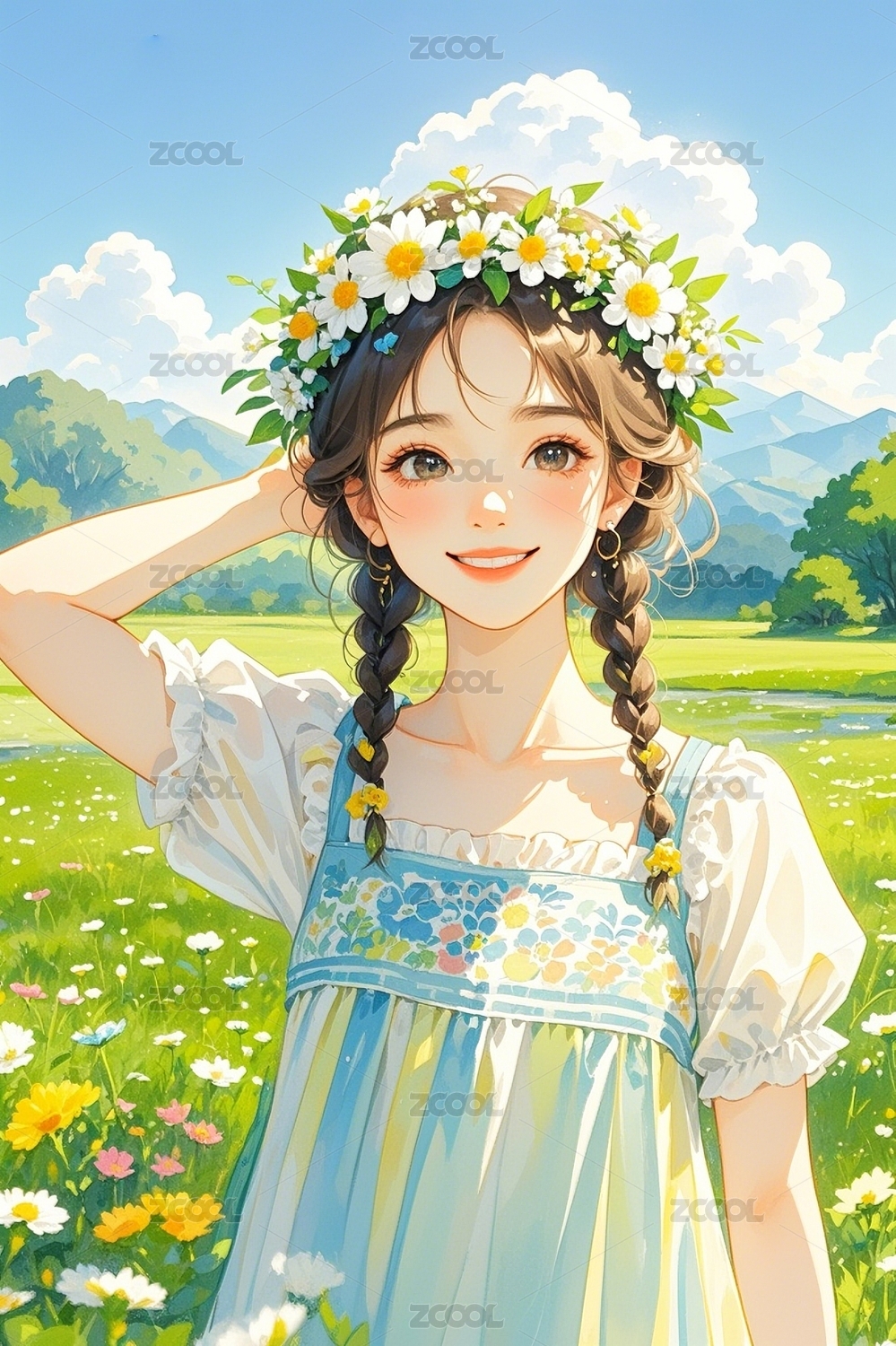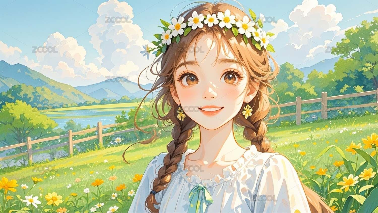 花环少女在阳光下的梦幻场景