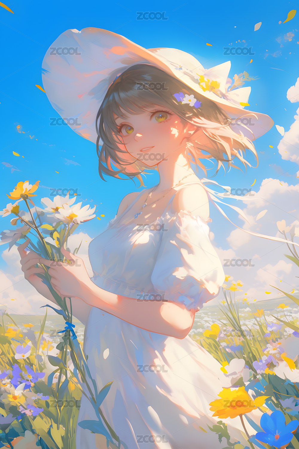 戴草帽的女孩在花田中微笑