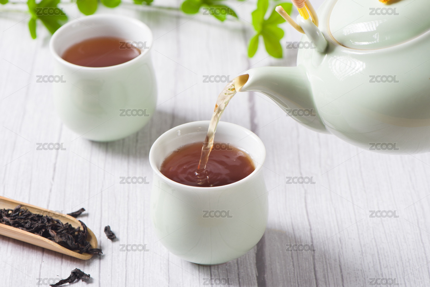 白底上放着的茶叶和茶具