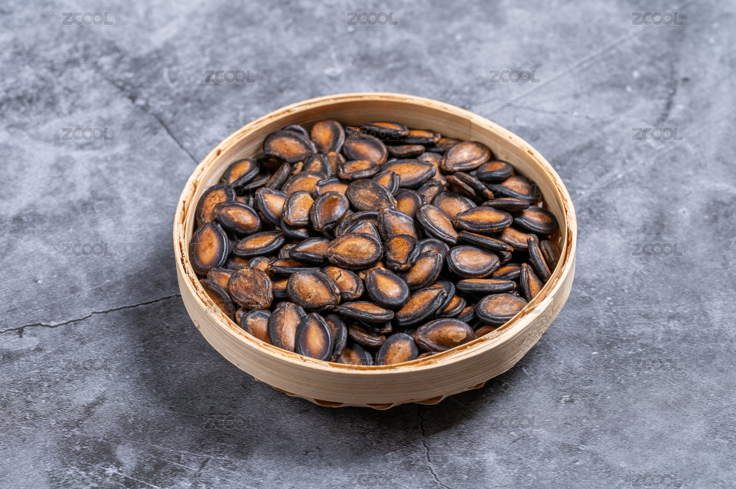 桌面上的木盘子里美味可口的黑瓜子