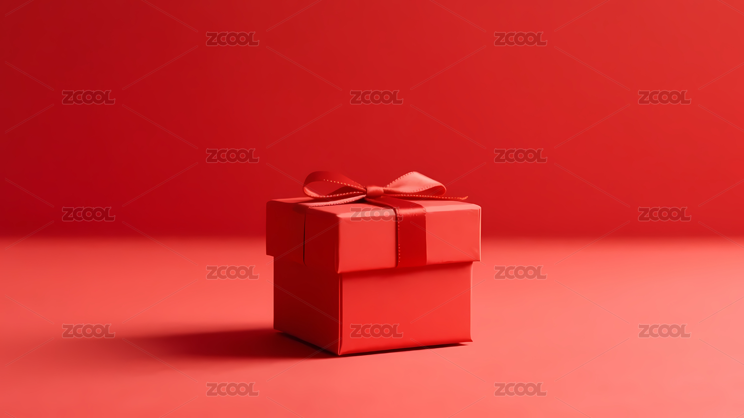 放在红色背景的绑着香槟色带子的红色礼物盒局部