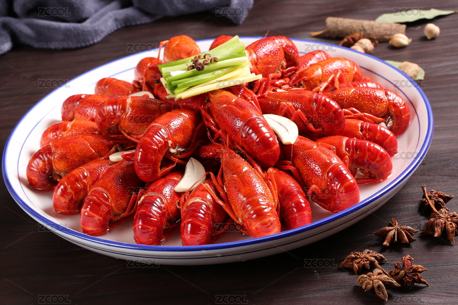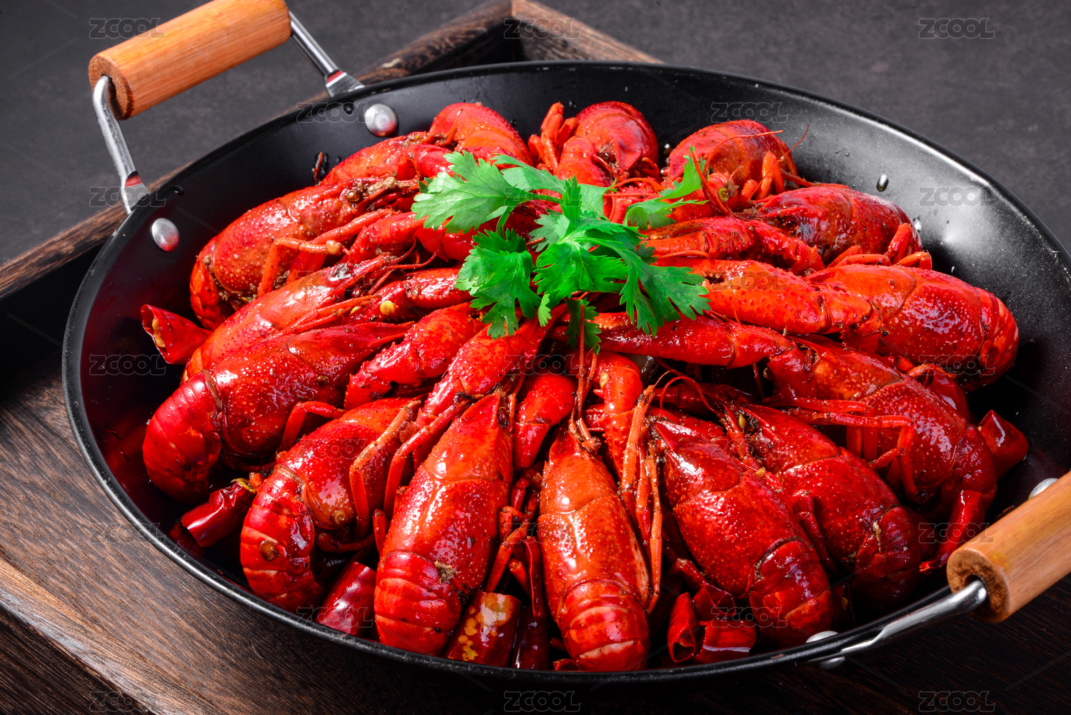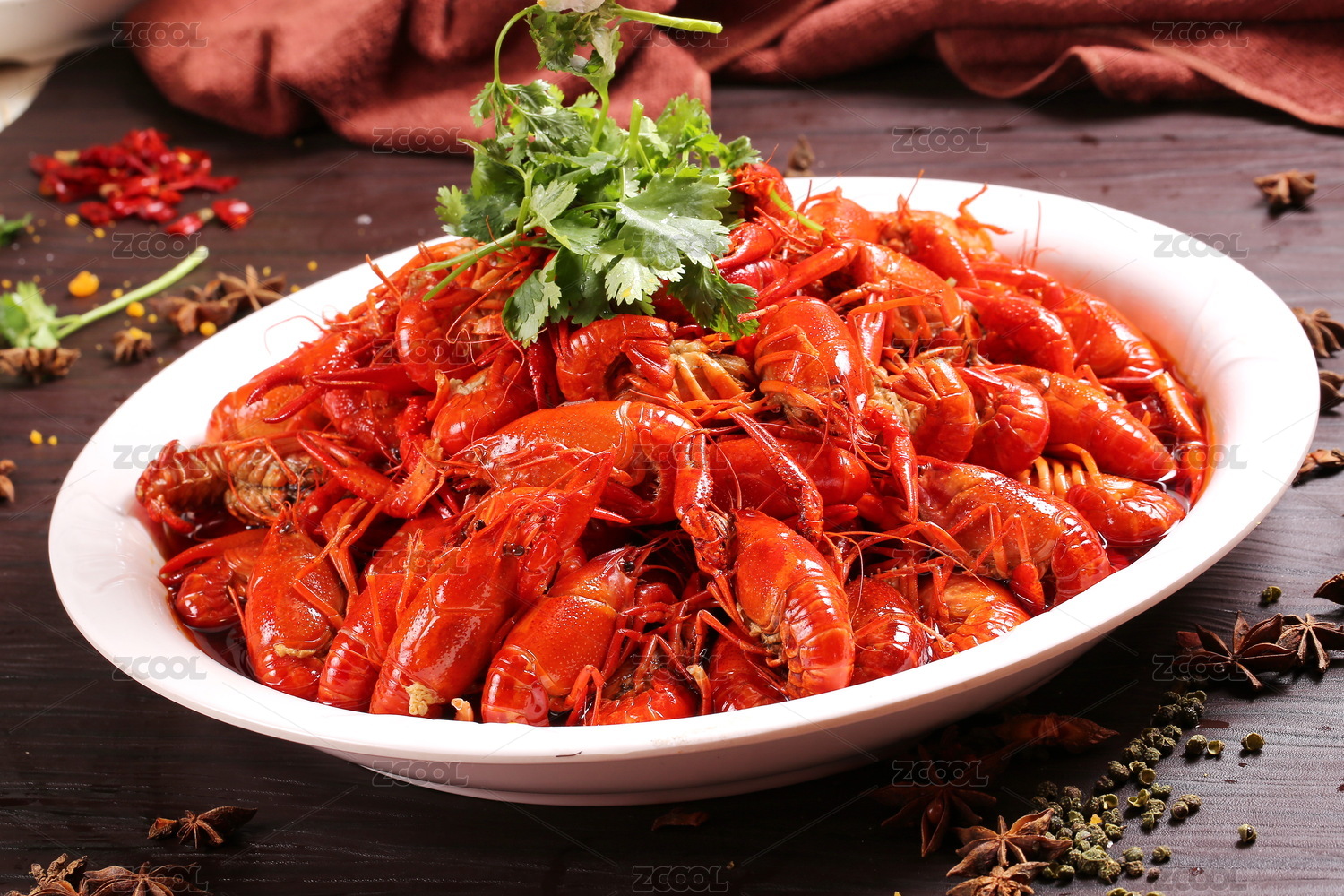 深色背景上一盘油焖大虾,上面点缀着香菜