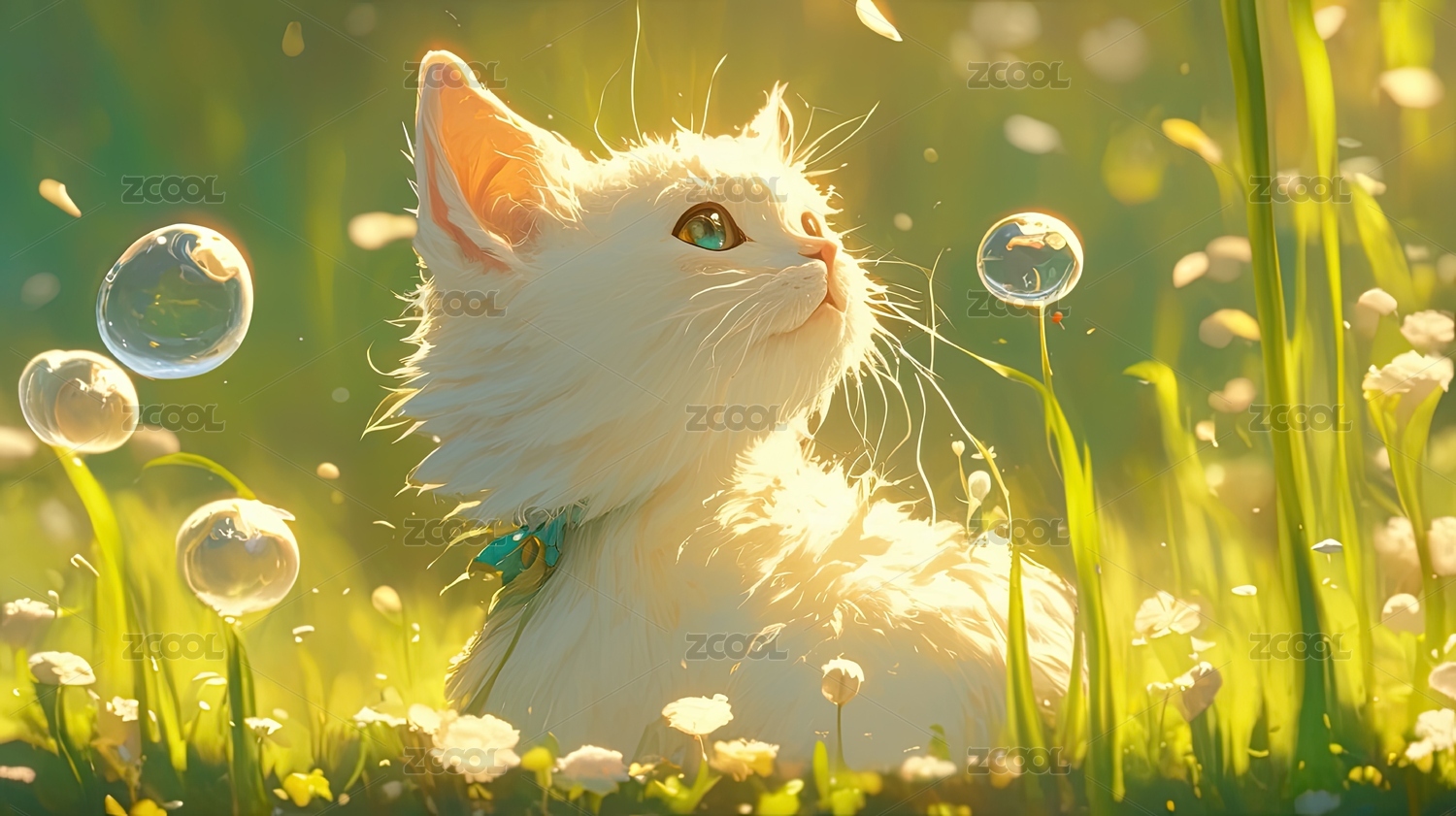 白猫在草地上仰望泡泡