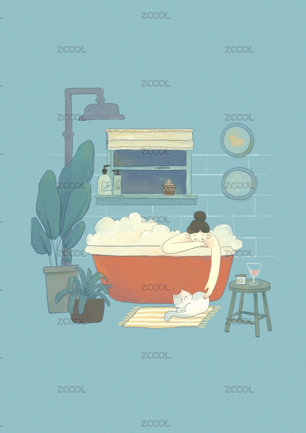 室内窗前女孩的早餐时光治愈手绘插画海报