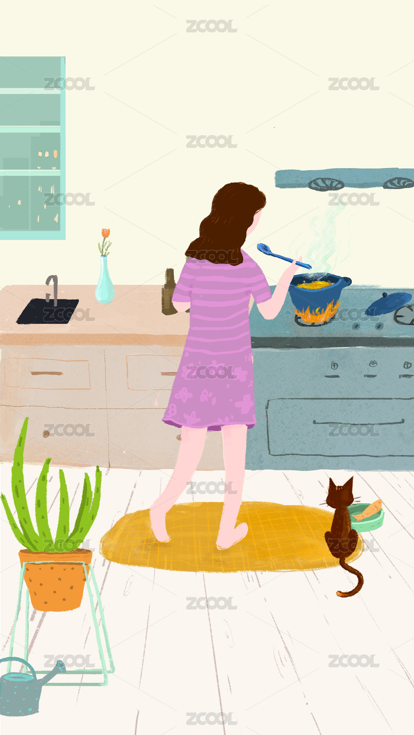 女孩,猫,厨房,烘焙,鸡蛋,牛奶,蛋糕,料理,西餐,家居