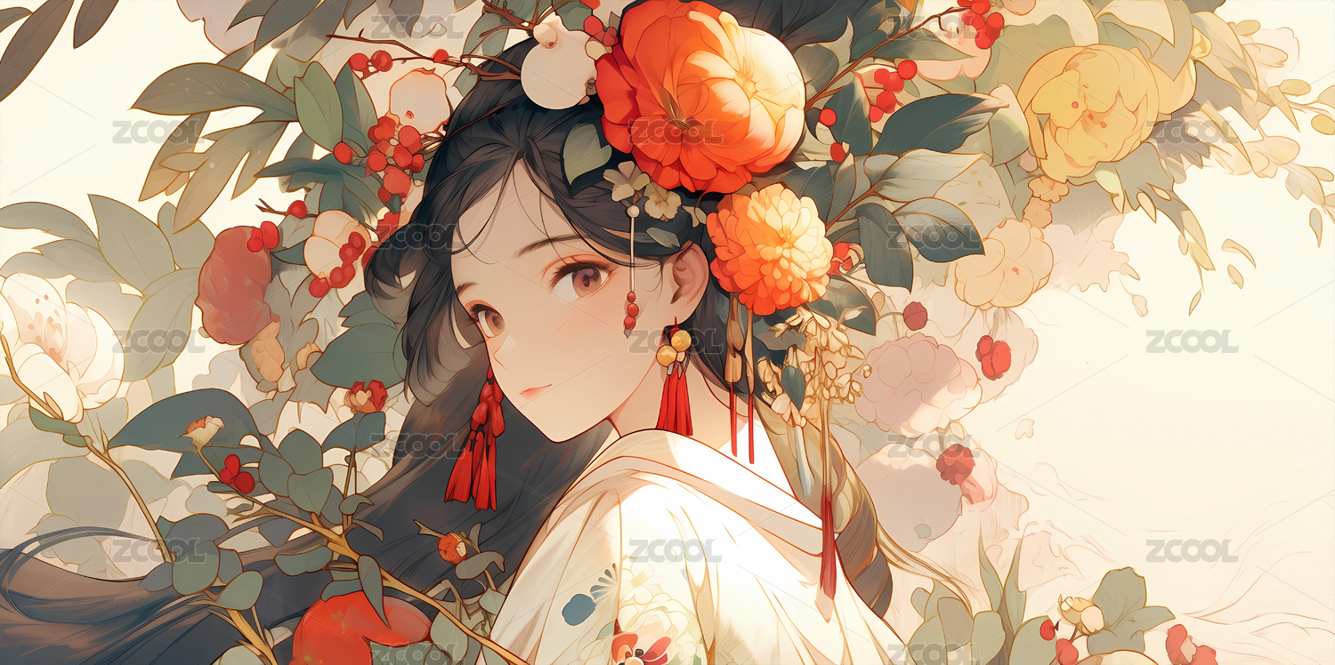 手绘,卡通,动漫,唯美,中国女孩,亚洲文化,女孩,亚洲女孩,盛装,吉祥