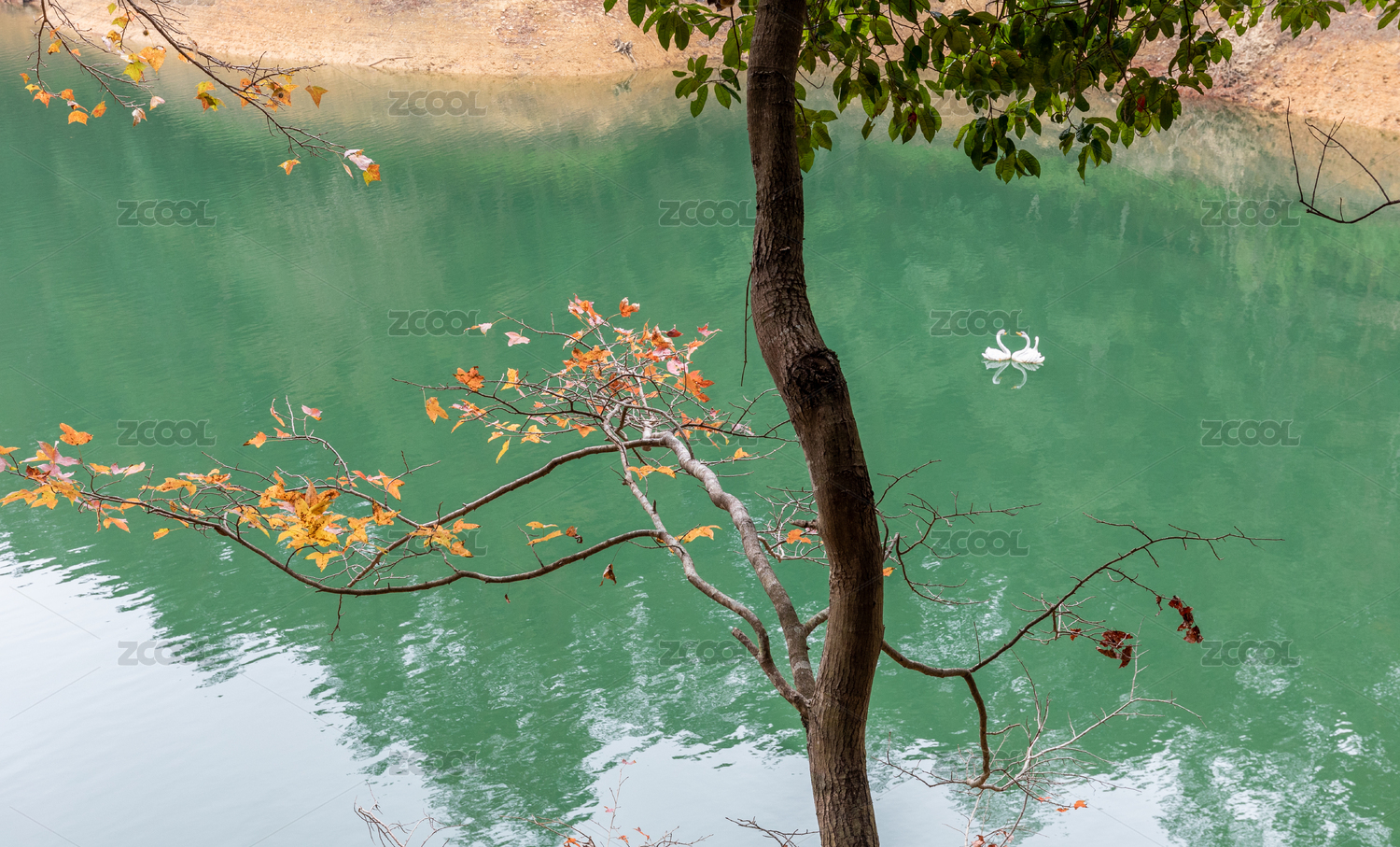 秋天蓝色的湖水与湖边黄色的枫树