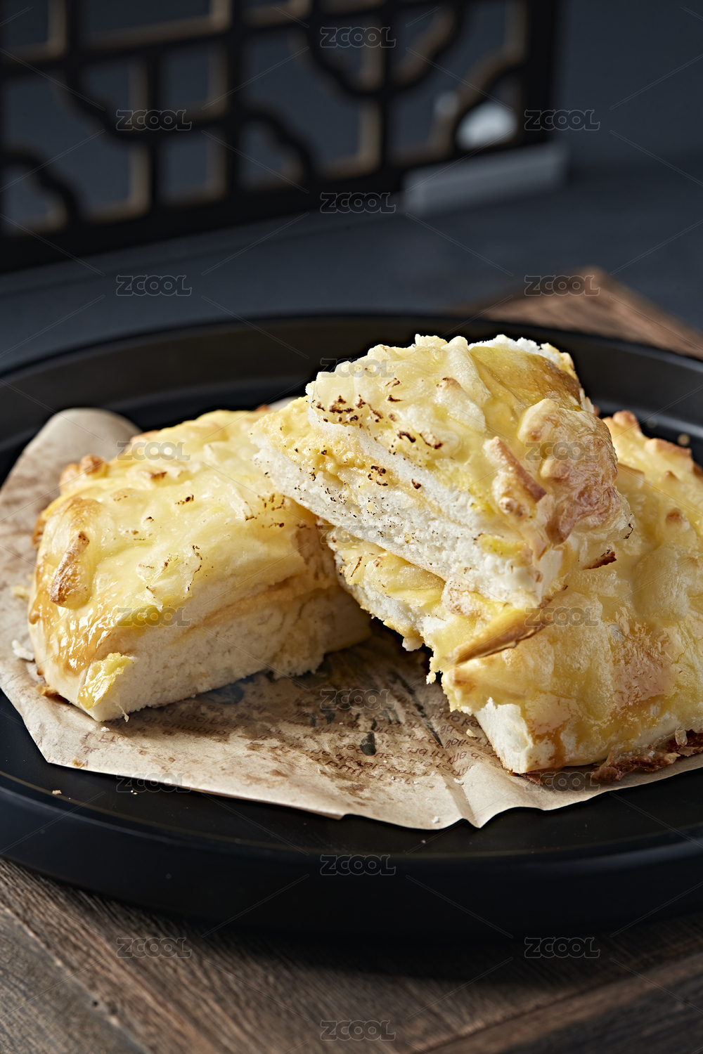 暗色木纹桌面上放着一份马苏里拉芝士焗榴莲