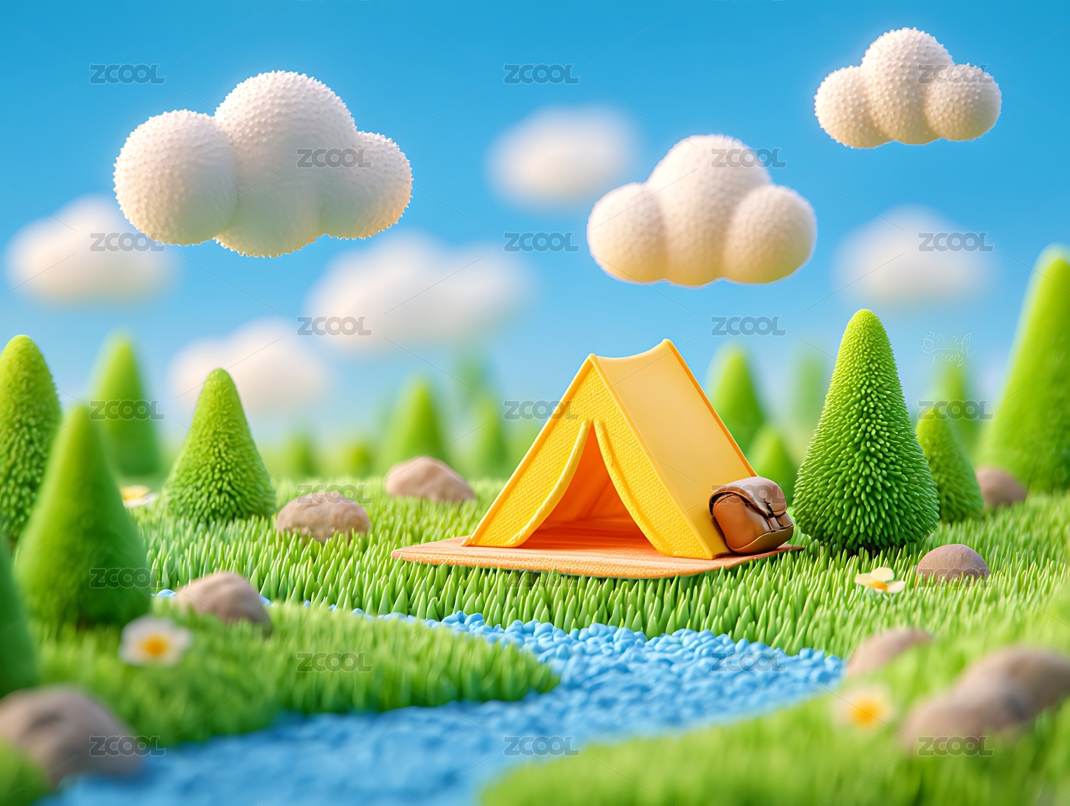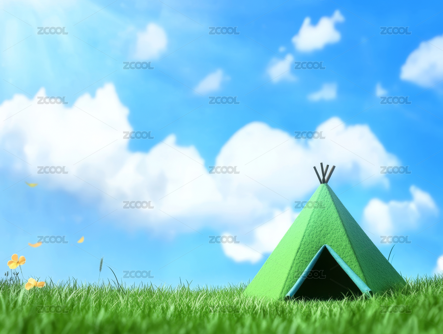 春天露营草地蓝天白云3D