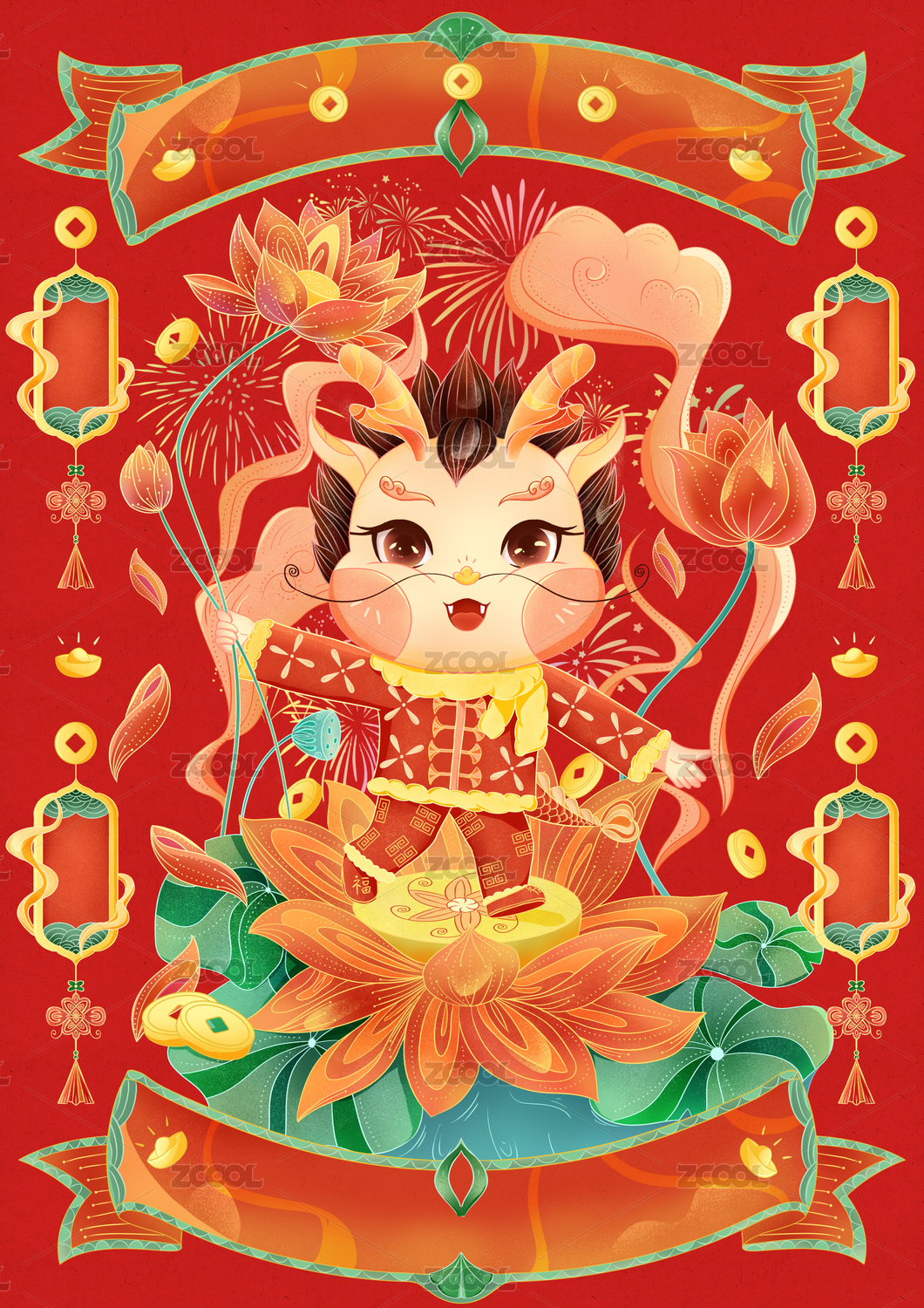 拟人生肖兔年喜庆过年拿如意矢量插画