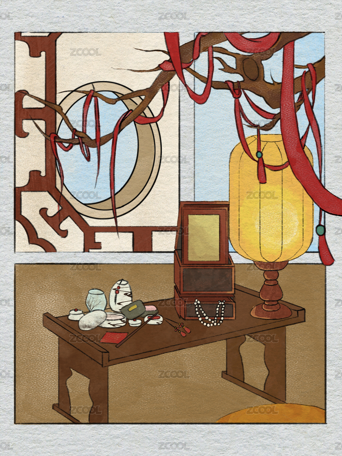 传统文化白天晴朗有花的墙面花格窗插画绘画