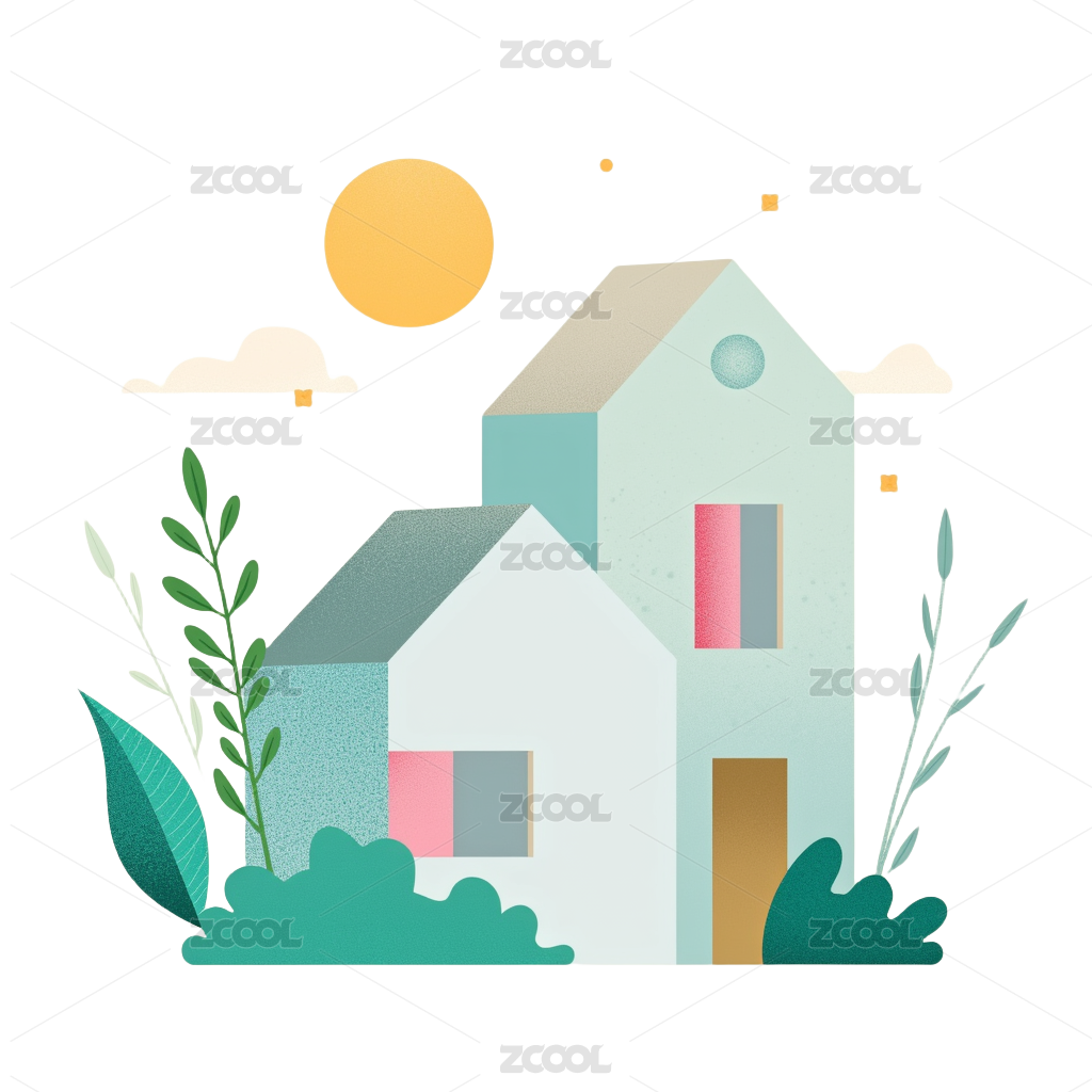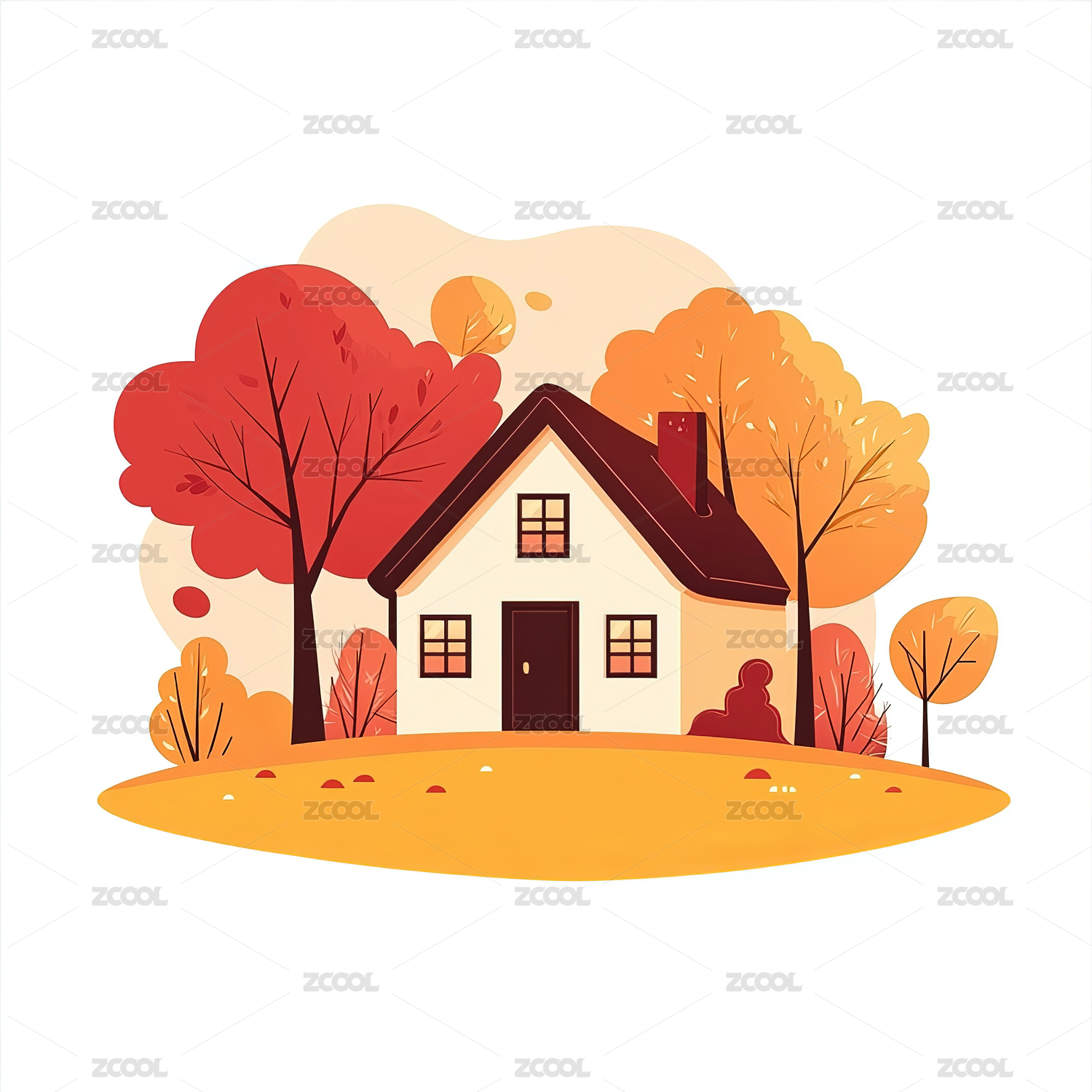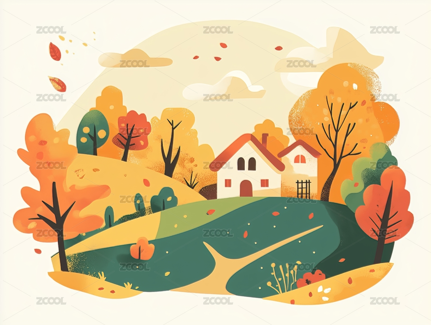 秋季城市景观插画,色彩鲜艳的房屋和树木