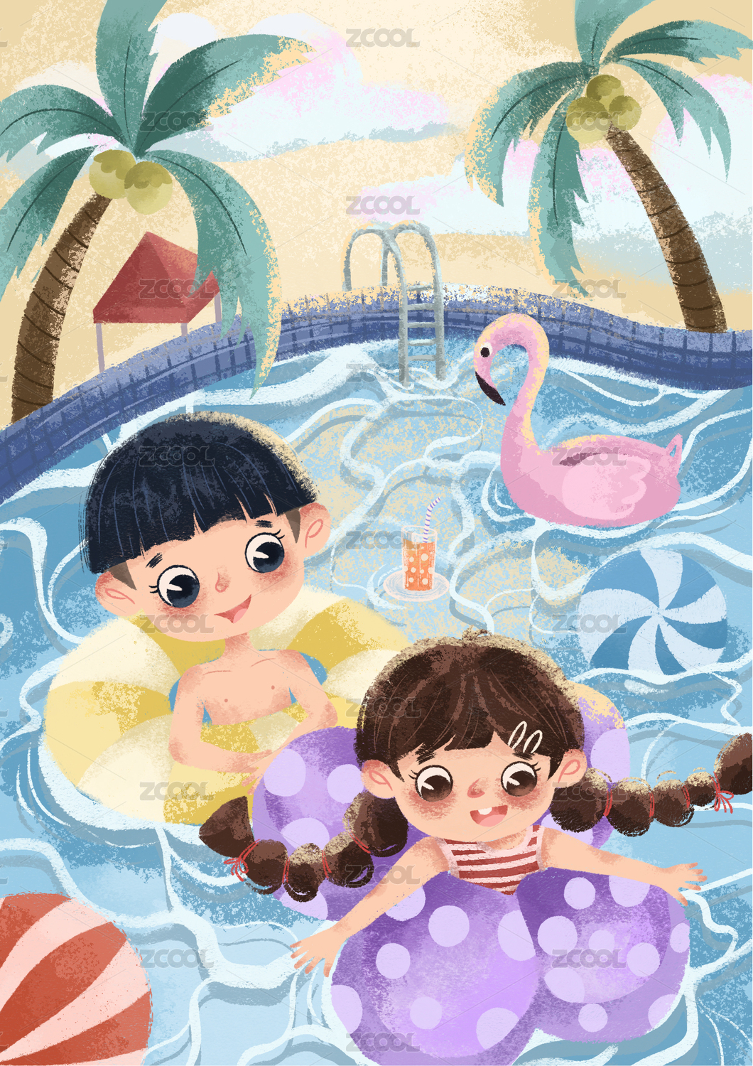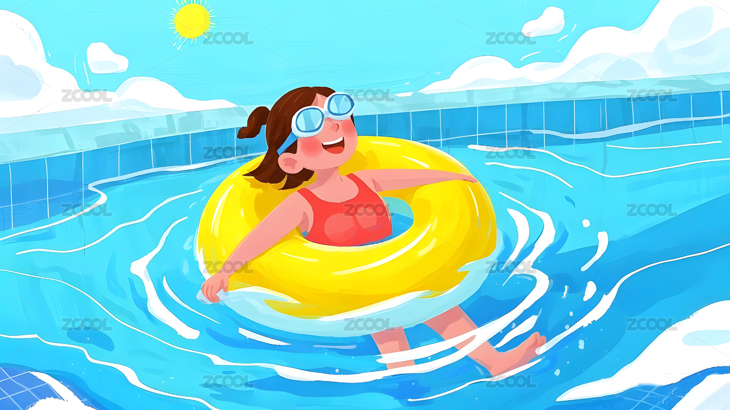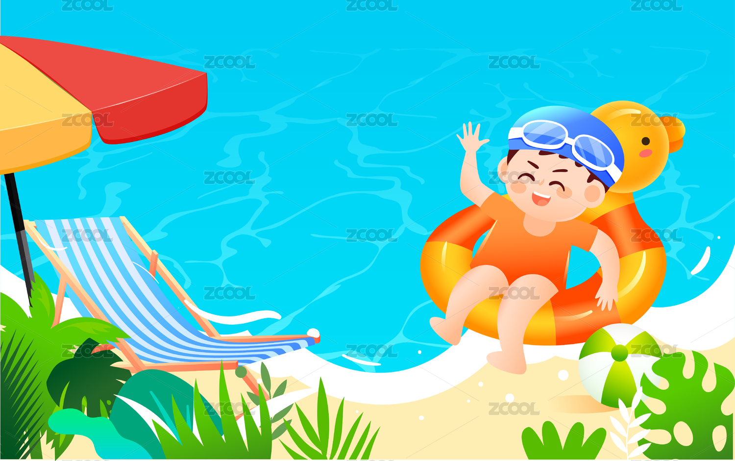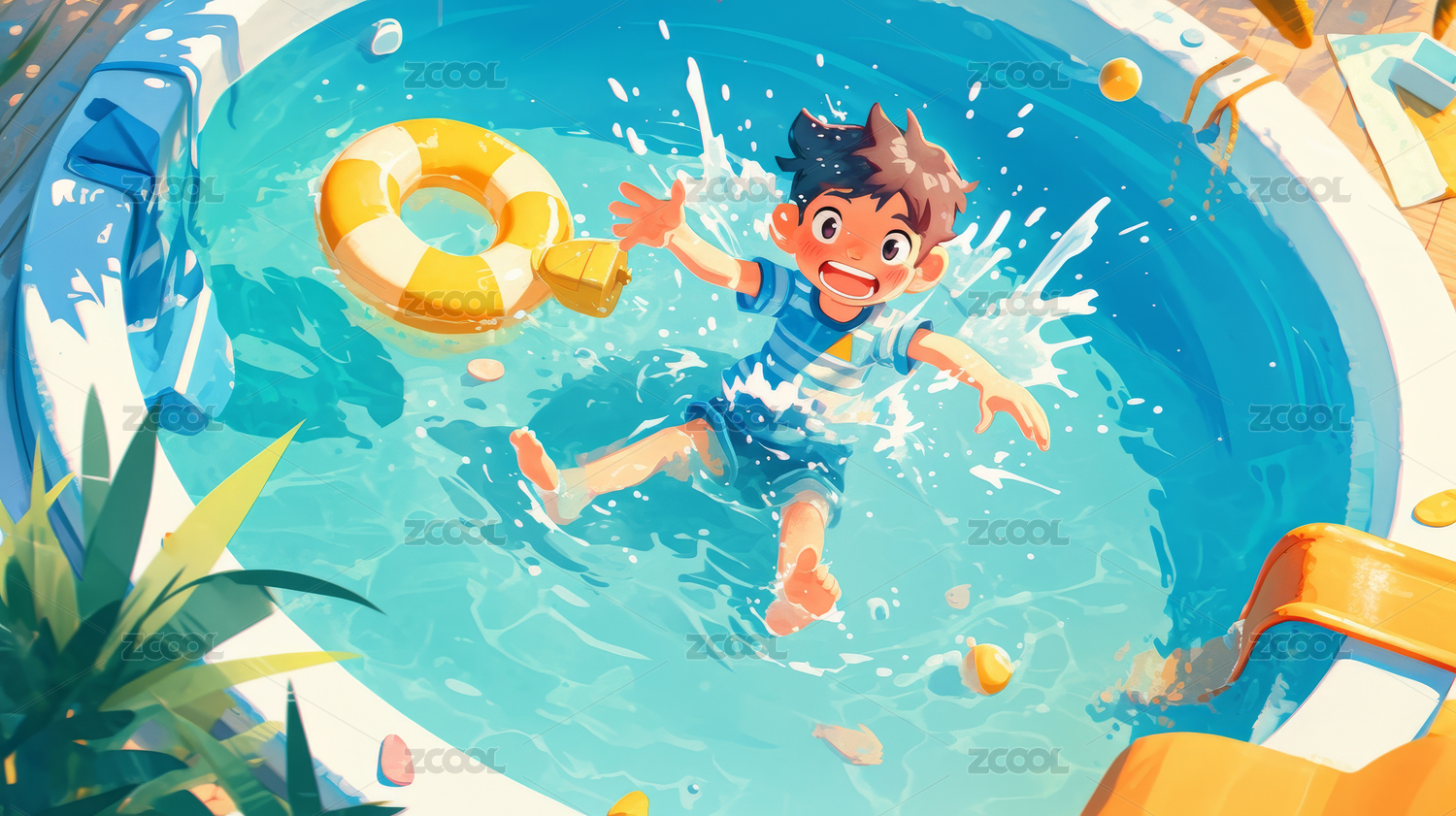暑假小孩游泳儿童节泳池度假运动场景插图