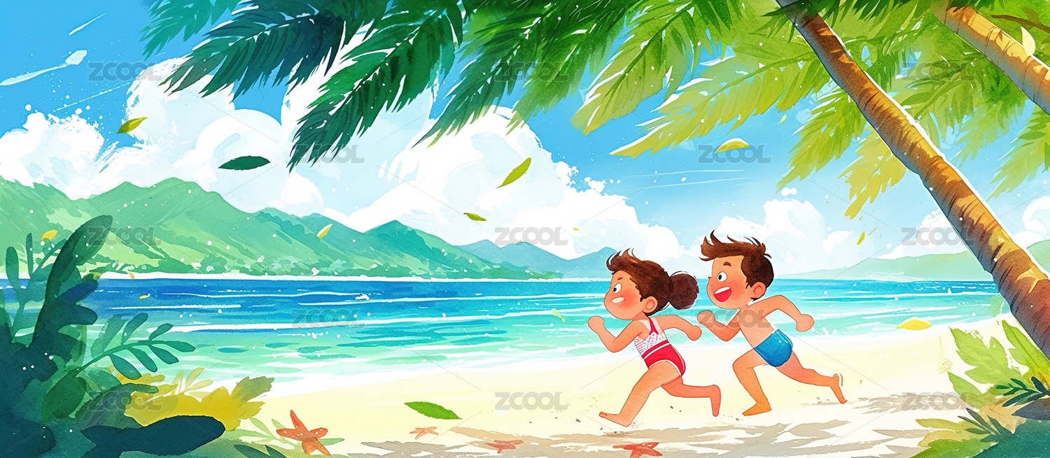 卡通儿童暑假假期海边沙滩玩耍冲浪旅行